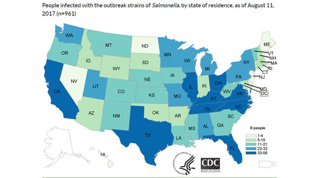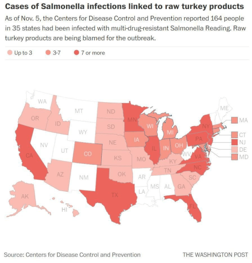 The CDC is right to exercise a degree of vigilance over reported cases of Salmonella infections and their strains, and WaPo was right to publicize just how many states have been struck by multiple reported cases of contaminated bacteria-bearing turkey meat–even if the mapping of a “spread of infection” is hardly able to be deciphered even by the best epidemiologist’s sleuthing, and suggested subliminal cautions about consuming any sort of undercooked meat, one possible clear culprit.