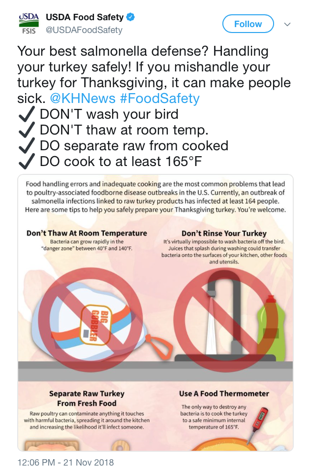Perude may have been profesionally distracted on social media, to be sure, between attention to tampering down alarms of the damage caused by Hurricane Michael across the Florida panhandle and the Camp Fire and Woolsey Fire in California, which unleashed alarms about forestry, agriculture, and water infrastructure. But the deceptive moves to pin the epidemic of wildfires on inadequate or lacking “forest management”–rather than climate change seem to be mirrored in his direction of public attention to the cultivation of best practices of poultry preparation to the exclusion of any acknowledgement of the widespread discovery of antibiotic-resistant bacteria within the very sorts of turkey meat that his family business has long prepared. Even if he tweeted on November 22 to followers to enjoin them to be conscious that “if you are preparing a meal, please remember we have American farmers to thank for the bounty,” erasing the industrial-scale structures of poultry farming –even as Perdue presided over the deregulation of the poultry industry, undoing powers that earlier administrations gave to small farmers who raise antibiotic-free fowl or work on contract for meat industry players–Butterball, Jennie-O, Cargill, and Farbest Foods–to bring charges against them for abusive distributive practices, introduced under the Obama administration to provide better guarantees to control meat production, in hopes to “control frivolous litigation,” that would and prevent agribusiness meat processing companies from setting terms to family farms–continuing the USDA’s existing regulations for meat packers and stockyards would only serve, poultry lobbyists argue, to “open the floodgates to frivolous and costly litigation,” but leaves distributors and agribusiness to dictate the terms of turkey sales, production, and livestock conditions.