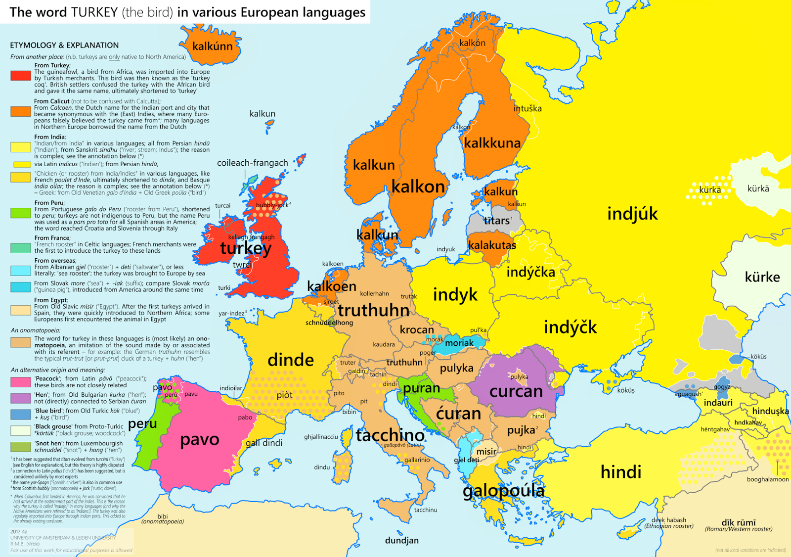 It is bizarre that the New World bird of distinctive appearance was already long labeled as an outsider, as if treated as a bit of a refugee. Although it arrived from the New World with chocolate and coffee, if from North America, the naming of the low-status bird that provides an annual image of bounty was rarely granted insider status, and rarely mapped correctly—but was long labeled a foreigner, in European languages: as English linked it obstinately with a Turkish provenance, confusing it with the African guinea-fowl, Spanish and much of central and Eastern Europe identified it as from India by an unrelated nomenclature, rather than the “indies,” nd Celtic northerners seems to have believed it from France, embedding the poor bird in a lexicon of geographic disorientation and almost compulsively attributing it an unclear origin in ways akin to shrugging shoulders, while all Scandinavia seem to have linked the fowl readily to Calcutta. The Armenian image of “sea rooster” most clearly acknowledges its overseas origins but is as unspecific as possible, although the sea-faring Portuguese show some greater interest in naming the foul with geographic precision in calling it a galo do Peru. The onomatopoeic appellations that spread throughout Mediterranean countries seem striking, but the cartographer May have been over-eager in assimilating the truthuhn to a gobble, given possible linguistic migration from other Saxon lands, and assimilation to a sort of hen.
