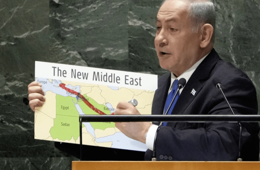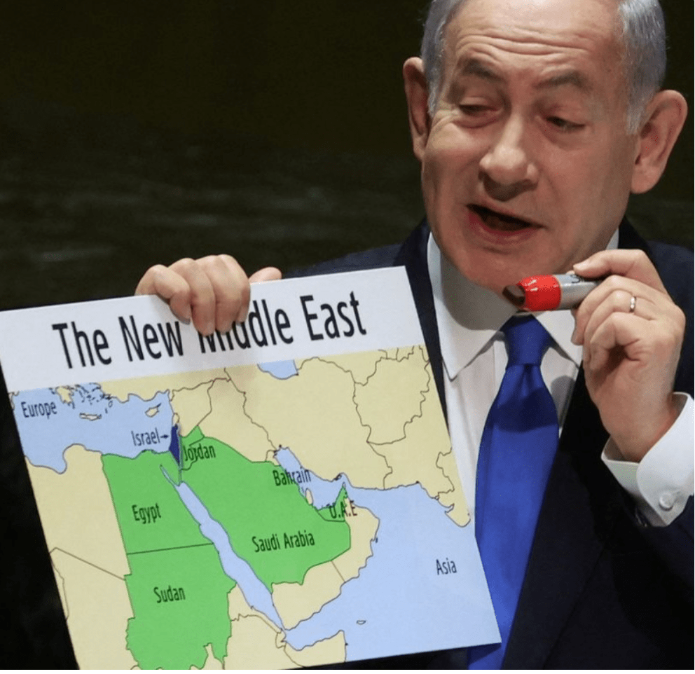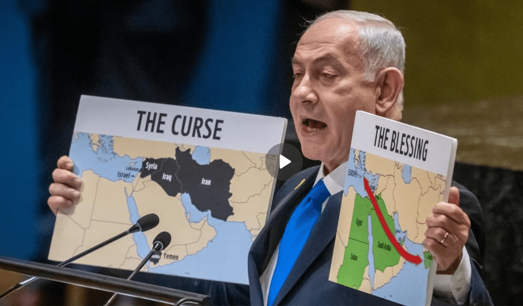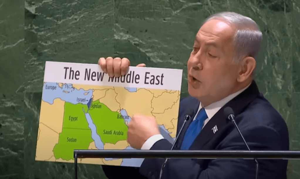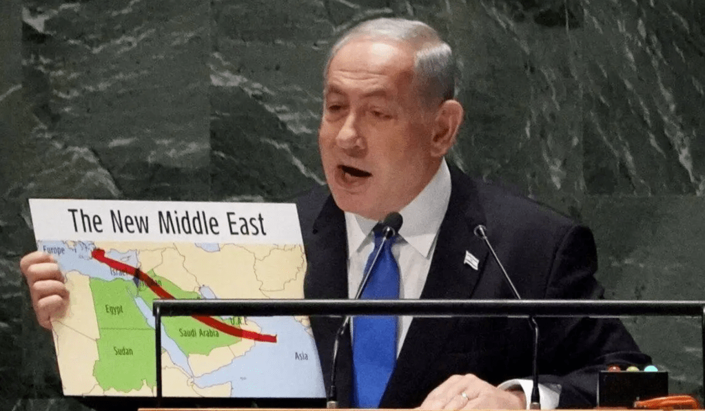 Map of “The New Middle East” Netanyahu Prominently Displayed to Address General Assembly Sept. 22, 2023/ Spencer Platt/AP