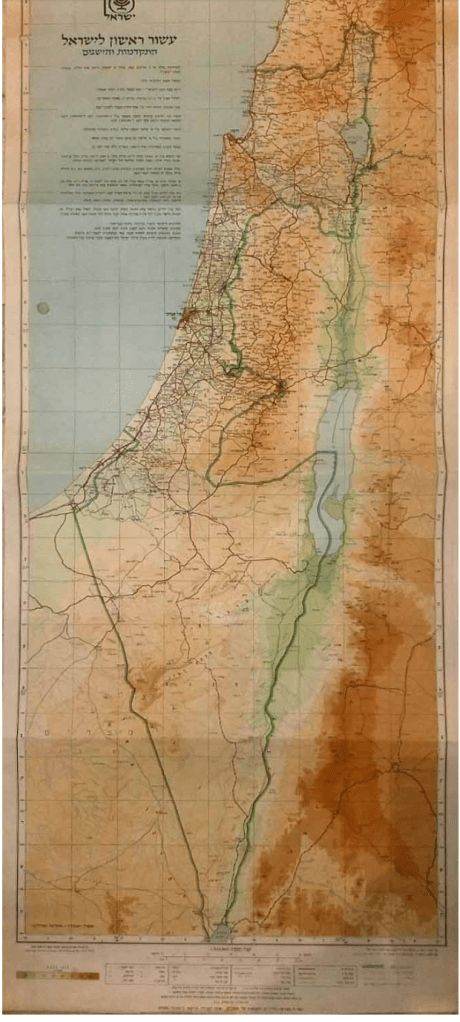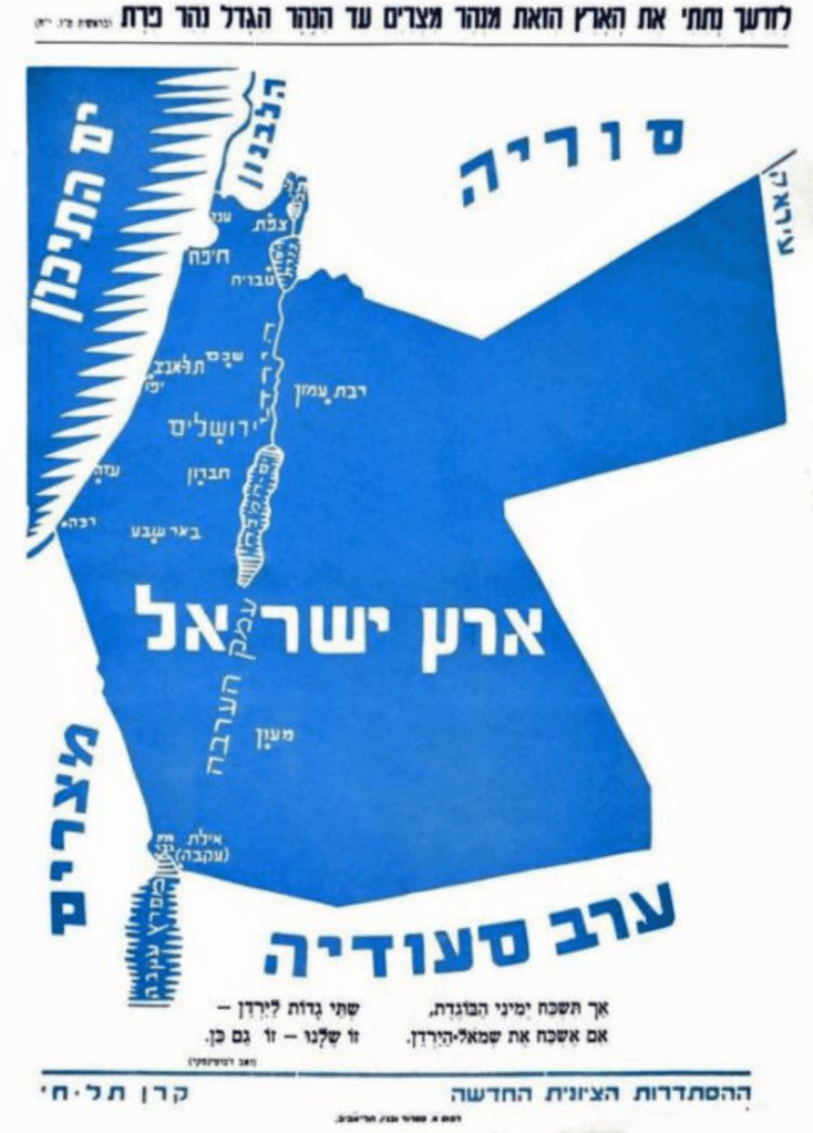 For this map–that places Palestine beyond the borders of Israel, in Lebanon, Jordan, and an “Arab Palestine” to the south of “Eretz Israel” of bright blue hue, that encompasses in its midst the biblical territory of Jerusalem, and the Jordan River, and assumes an almost cloak-like form, in a land map recalls modernist abstract expressionism argues that lands promised to the children of Israel when they left Egypt in Exodus or Deuteronomy offers a template to a modern Israeli state–“two banks the [River] Jordan has./One belongs to us; the other does as well,” read lyrics at its base, redrawing state borders already being negotiated in interwar years.