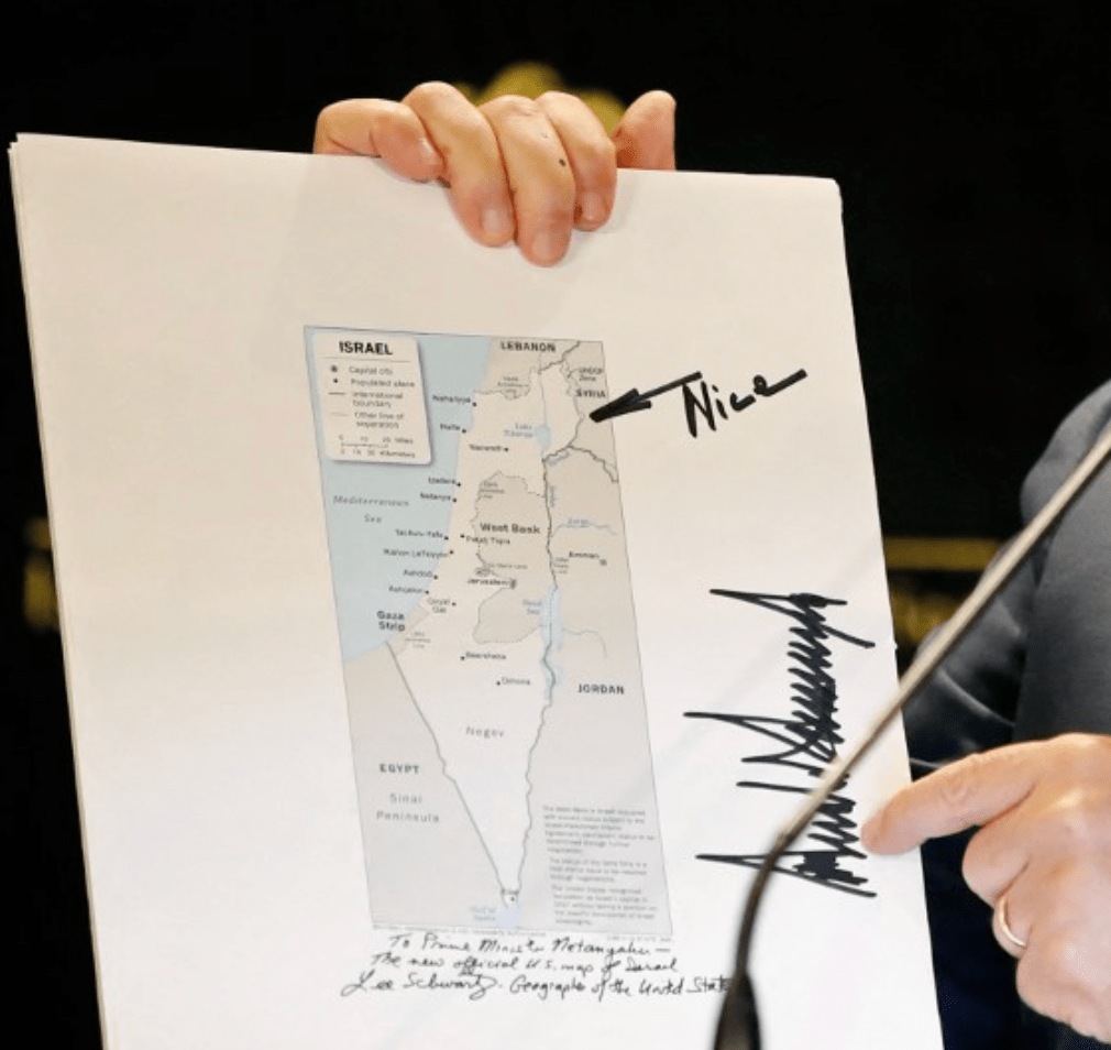 But the closest appearance of Trump’s figurer prints lay on “the new official U.S. map of Israel” that Trump personally allowed Kushner to give to Prime Minister Netanyahu, as a promise to be in his court, in his February 2019 trip by the apprentice Kushner, the thirty-eight year old son-in-law Trump had placed in charge of the deal he called a “peace process’ that at last recognized the Golan Heights–a site of the current war between Hezbollah and Israel–as Israeli territory. This map set a powerful precedent of similar international precedence essentially recognizing lands occupied since 1967, and annexed to Israeli territory in 1981, removing what the rest of the world recognized as Syrian territory that the Israeli army had occupied, as part of Israel’s sovereign grounds. Indeed, the “plan” registered a severe and unidirectional loss of Palestinian lands that Al Jazeera was quick to note, removing lands form Palestinian sovereignty to make the Oslo Accords look like the good old days, shrinking land under Palestinian control away from the West Bank and limiting jurisdictions.