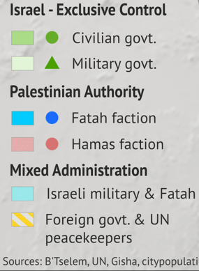 The geopolitical situation as he spoke was extremely complex, but the presence of Palestine was masked in mapping Israel by a blue island by the River Jordan held before the General Assembly, in ways oddly incongruous with the image of global peace on the lectern from which he spoke. The map clearly showed a West Bank and Gaza under Israeli control, even though the situation on the ground as he spoke was one of fragmentary political control by both Hamas in Gaza and Fatah in the Jordan Valley, largely subject to the “supervision” of Israel’s government. The complex administration of the areas of Fatah control in the West Bank and Jordan Valley contrast to muted blue areas jointly administered by Fatah and the Israeli military, and a light green sea of Israeli military control surrounding the lands of settlers in the Jordan Valley If the blue regions were subject to joint administration by Fatah and the Israeli army, light green showing areas of Israeli military control, rather than administration by a civil government, the airspace of the entire region was administered by Israel, but the entire region not controlled by any means by an Israeli state.
