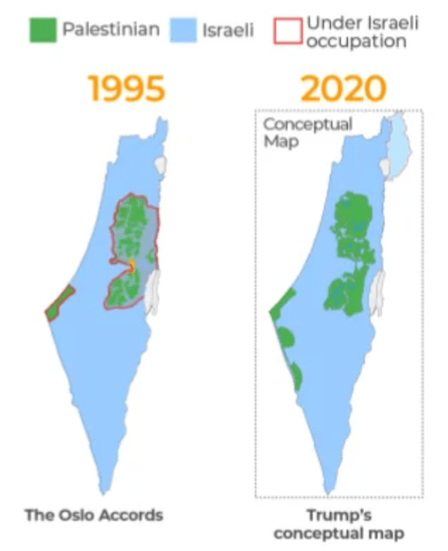 Despite the global revulsion at the killing of civilians, forced migrations, and violent atrocities, it is so difficult to process for the violence of suffering we may forget the tactical role maps of supposed peace “solutions” played preceding these struggles–and indeed how “remapping” the Middle East to defuse its conflict only served to sanction or endorse an unprecedented explosion of violence. Did the maps that the Trump White House created, assisted by the Office of the Geographer in the U.S. State Department, help to sanction a ground plan to drivePalestinians from Israel’s borders?The cartographic framework that President Trump deceptively promoted in his first Presidential term as a “Deal of the Century” was boasted to be a gift to the Middle East remade the borders and normalized the rebordering of Israel in quite violent ways. The consolidation of expansive borders was done quite aggressively-by invoking far-right Israeli ideas of territoriality of scriptural precedent removed from the ground, rooted in myth more than precedent. Trump bombastically magnified a “deal” that was of course both one-sided and deceptive, not a treaty or process of negotiation, and perhaps never really or truly on the table; it demanded few sacrifices if any from Israel even as it promised it was an end of sectarian violence.