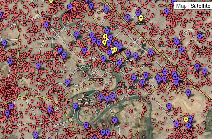 When mapping drone strikes on a more concrete local map of a recognizably urban area of Waziristan, Miram Shah, we might prefer to employ equally disembodied icons of explosions.