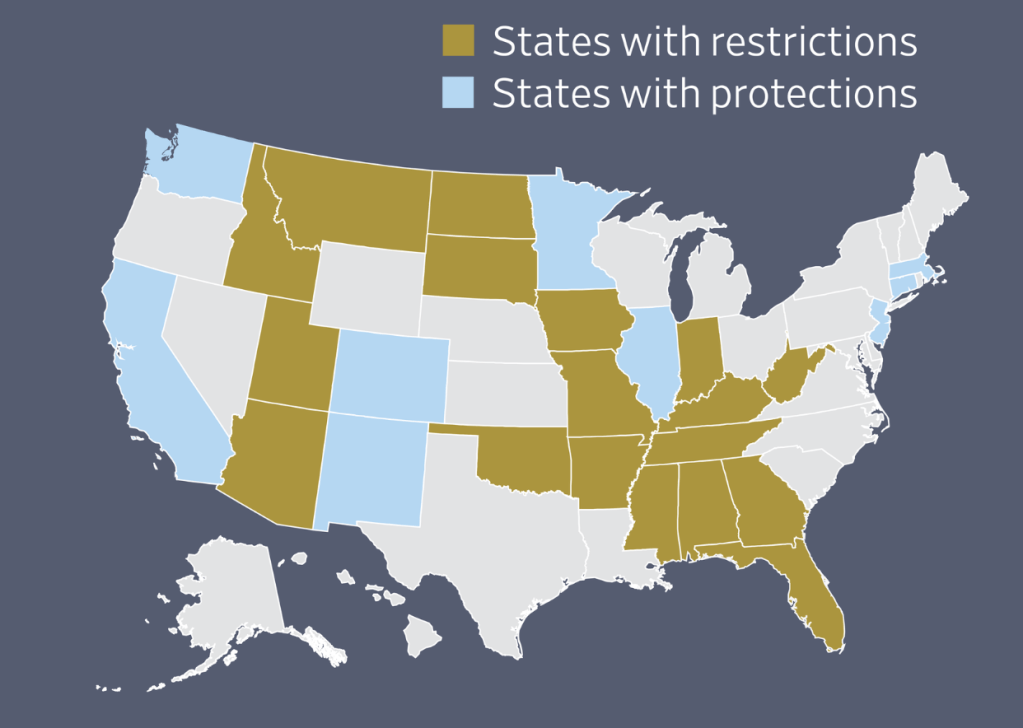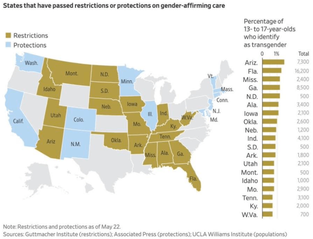 To be sure, to cite a recent news maps of the change that has swept across America of Orbán-like doctrine, mental health was thrown to the winds by the broad imposition of restrictions on gender identification, as a slew of “red” states have introduced restrictions on gender-affirming care across the nation, per the Guttmacher Institute, crating a cleft across the nation of the Orbán-esque policy by enacting outright restrictive transgender laws or curtailing care for trans teens in states over the past two years–a new hot-button issues to motivate to intensify political polarization by invasive restrictions on competitive sports, restroom use, and other health care. The adoption by state legislatures of restrictions and protections a new front of divisive polarization of increasingly sharp lines, as a terrifyingly contiguous block of “red state” litmus tests of knee jerk variety now threaten to return critical swing states–Georgia; Florida; Arizona–into a hard conservative fold.