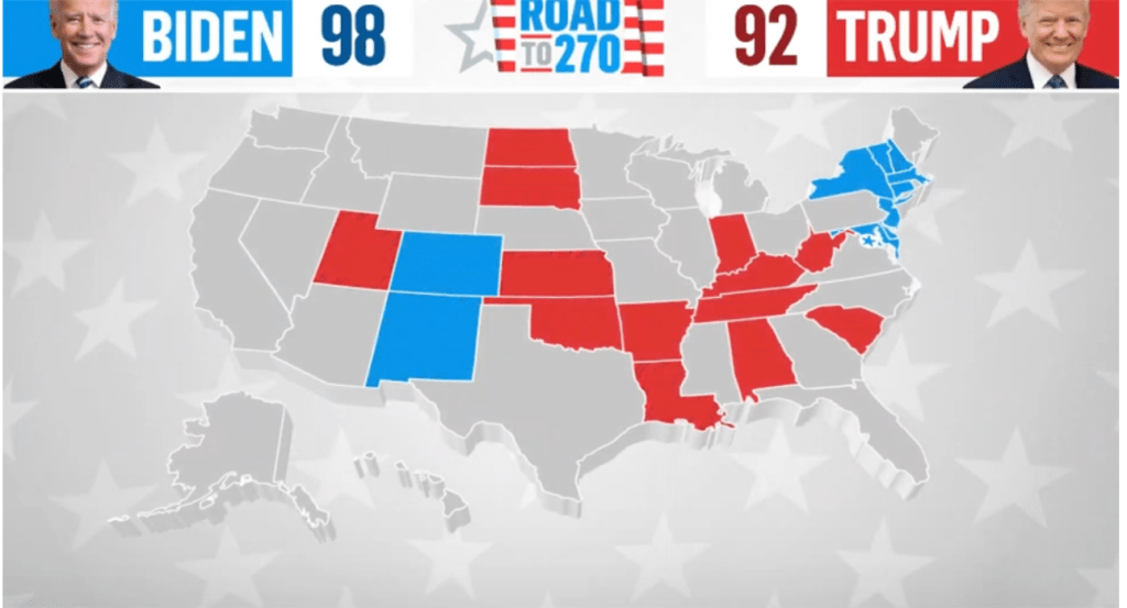 While the red swath had grown far less monolithic in the early hours of the tally of the 2020 election, in ways that might have seemed to warrant a challenge to Carlson’s logo, the map of 2016 was an icon for the “news” hour, the logo was so iconic that it had not changed,–even as the recent election suggested an opening in the monolithic division of blue and red states, and a more closely divided vote indeed. But as election denialism continued, Carlson had clung to the 2016 map, which occupied a central place in the ideological bent of his viewing audience, who saw that victory as a new road map for partisan identity–even as the states seemed to break in a different manner. Indeed, the early results on the “magic walls” on interactive news screens quickly reconfigured the logo that Tucker Carlson had used as the back screen of his nightly partisan broadcasts.