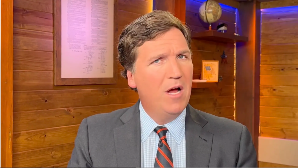 Tucker Carlson let his viewers know that after he left the FoxNews network, in the fallout from settlement of the Dominion lawsuit out of court, texts disparaging Donald Trump and revelations of improperly sexist newsroom behavior were less the reason than claiming moral high ground. But Carlson may have been protesting too much: his show had almost intently if not obsessively exploited a politics of grievance to fostered since 2017 the hyper-partisan division of the United States. The recurring topic of the show was stated in the electoral map logo of red expanse and blue readouts that hung in the background of his nightly rants–Carlson’s news commentary fit the slightly blurred map of the electoral division of the nation, now an existential fact and eternal lesson in ways that its content didn’t even demand to be interpreted, glossed or read.