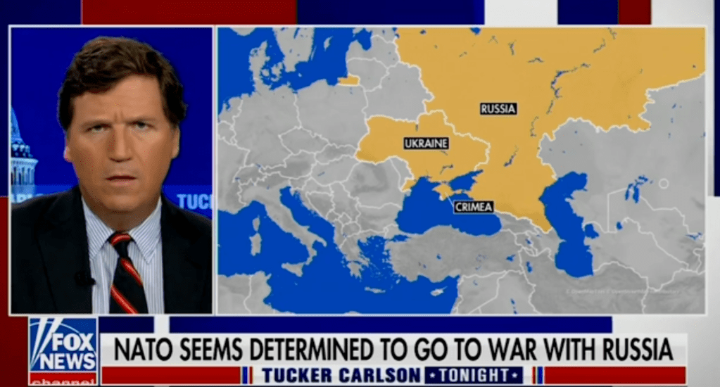 Intentionally sewing a cunning cartographic deception in coloring “Ukraine” and Russia by the same color–and not only Crimea–as if to dupe listeners into thinking the war a mater of secession, confusing the question of Ukraine’s pre-2014 and pre-February,2022 borders by arguing that Ukraine was unreasonably demanding “taking Russian Crimea from Russia” as a hostile act. In asking if NATO was “determined to go to war with Russia,” Carlson may have been exercising free speech, but was rather deviously and dangerously questioning Ukraine’s sovereign status. (Yes, Carlson had insisted, invading Ukraine would lead, as Russia said “many times, . . . would lead to nuclear war” and likened its Prime Minister to the “manager of a strip club” but was entitled to his free speech by his constitutional rights.)