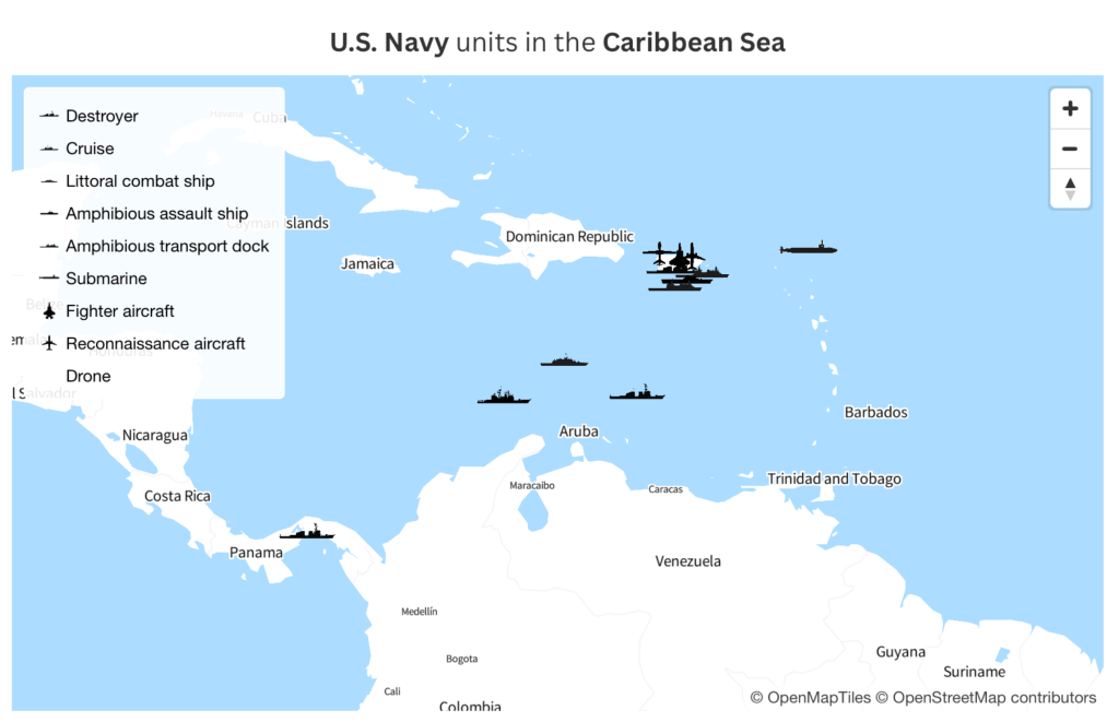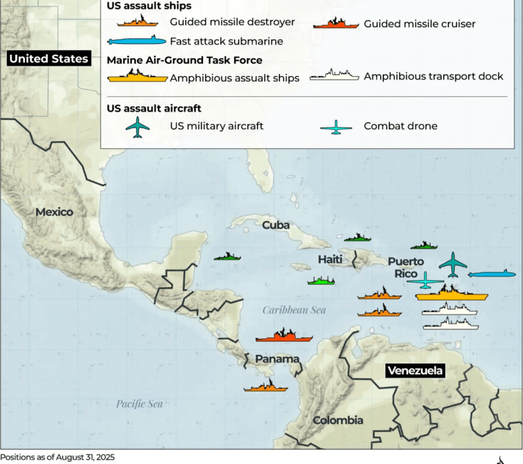 The border wall indeed receded into the baground, fast forgotten in comparison to the extent to which bombing offshore ships blurred the boundaries of territoriality in a misguided attempt to staunch the flow of drugs–a flow Trump and his henchmen too often argued is accomplished by smuggling routes able to be stopped by immigrants, as if this prevented the flow of cocaine, fentanyl and methamphetamines across the border–the blurring of territoriality now goes far beyond the “big stick” of the Monroe Doctrine that the nomenclature of the “Trump Doctrine” echoes, and sets a new standard for a “gunboat diplomacy” now waged from the skies, and from seven warships and aircraft carriers stationed in Caribbean waters by September 1–carrying over 4,500 sailors and marines beyond the nation’s frontiers, in a quite sudden and unexpected military buildup designed to “combat and dismantle drug trafficking organizations, criminal cartels and these foreign terrorist organizations in our hemisphere.” Is the sending warships a new expanse of borders to patrol international waters an act of aggression, or a war against non-state actors?