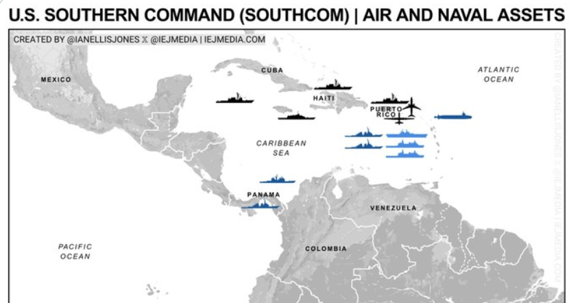 Having renamed the Gulf of Mexico as the Gulf of America with little global pushback, if plenty of raised eyebrows, the recent expansion of targeted bombings on craft accused of ferrying drugs destined for markets of American customers–and cast as the pending incursions by foreign gangs of the nation–have occurred with the reactivation of American bases in the hemisphere, far outside of territorial waters, to a new level of alertness not seen since the Cold War–an amassing of 10,000 troops and expansion of military staging grounds that are intended only to facilitate extrajudicial executions far beyond the line of the border wall on pause since being built in Trump’s first term.