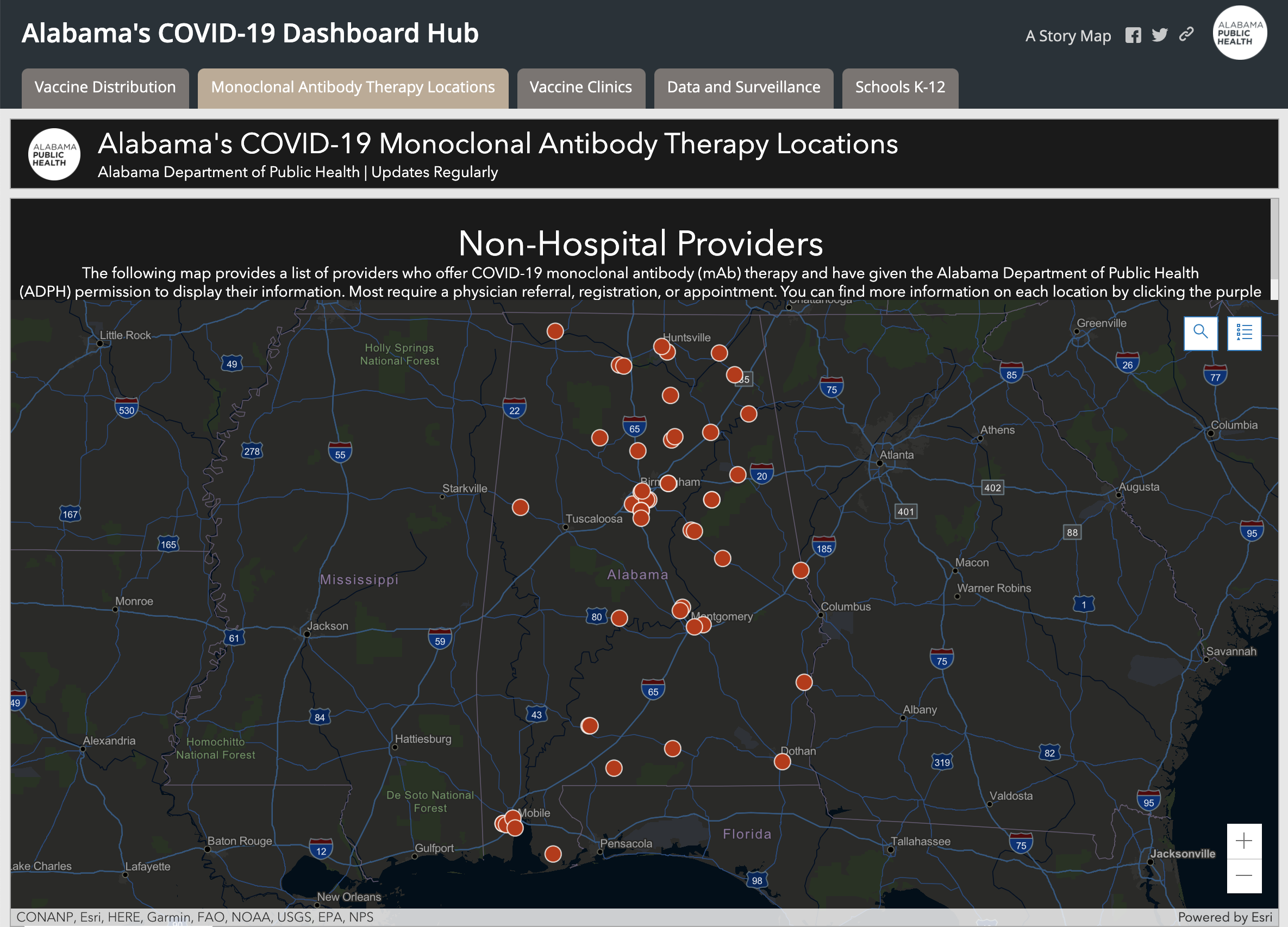 DeSantis chose another official to be an attack dog to step up vaccine disinformation. The campaign of disinformation continued DeSantis had appointed a surrogate “State Surgeon General” who stood beside vaccine skeptics who encouraged misinformation from claiming the vaccine altered your genetic RNA to a lack of scientific consensus in its value. Surgeon General Ladopo spread dangerous COVID denialism, instructing the public “to stick with their intuition and their sensibilities,” demeaning the public health value of the vaccine a misguided “religion” and emphasizing the monoclonal antibodies treatments DeSantis has vigorously promoted in the place of vaccines–and indeed as an alternative public health policy. In so doing, he mimicking the public health maps like Alabama’s “COVID-19 Dashboard Map” that foregrounded Monoclonal Antibody Therapy (mAb) therapy as a counterpart to Vaccine Distribution in an ESRI Story Map; Alabama’s Dept. of Health boasted a 60-70% success rate at “preventing high-risk patients” from being hospitalized–a strategy of off-loading any public health care policy or plan.