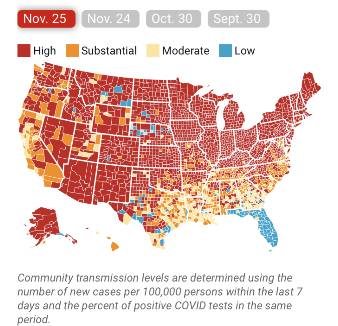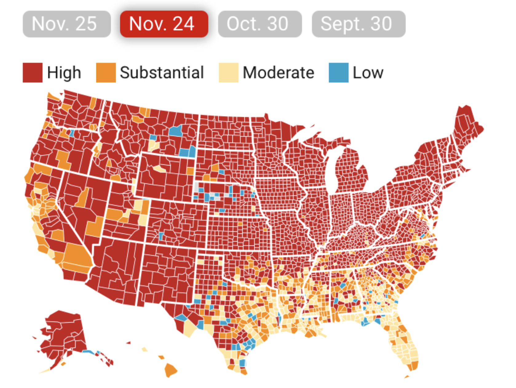 The flimsily persuasive nature of the cherry-picked data of the data vis can be handily spot checked on the CDC website itself, by stepping back just one day for a better view of the risk levels of putting caution aside and heading to the beach. For the lag of a few days of renewing data reminds us of how important the daily release of accurate data is, and how easily it can skew a national image of community transmission that seems to provide a “snapshot” of national levels. Florida’s rates of infection didn’t remain an island from the nation, so much as a lag in reporting failed to show comparable rates of infection to the rest of the nation. The differences were not so pronounced: indeed, the previous day–November 24–mapped the state as being a site of moderate and substantial transmission that could not have suddenly shifted in but one day, so much as the new visualization fit the “narrative” about DeSantis and COVID-19, more than the situation that Floridians experienced on the ground.