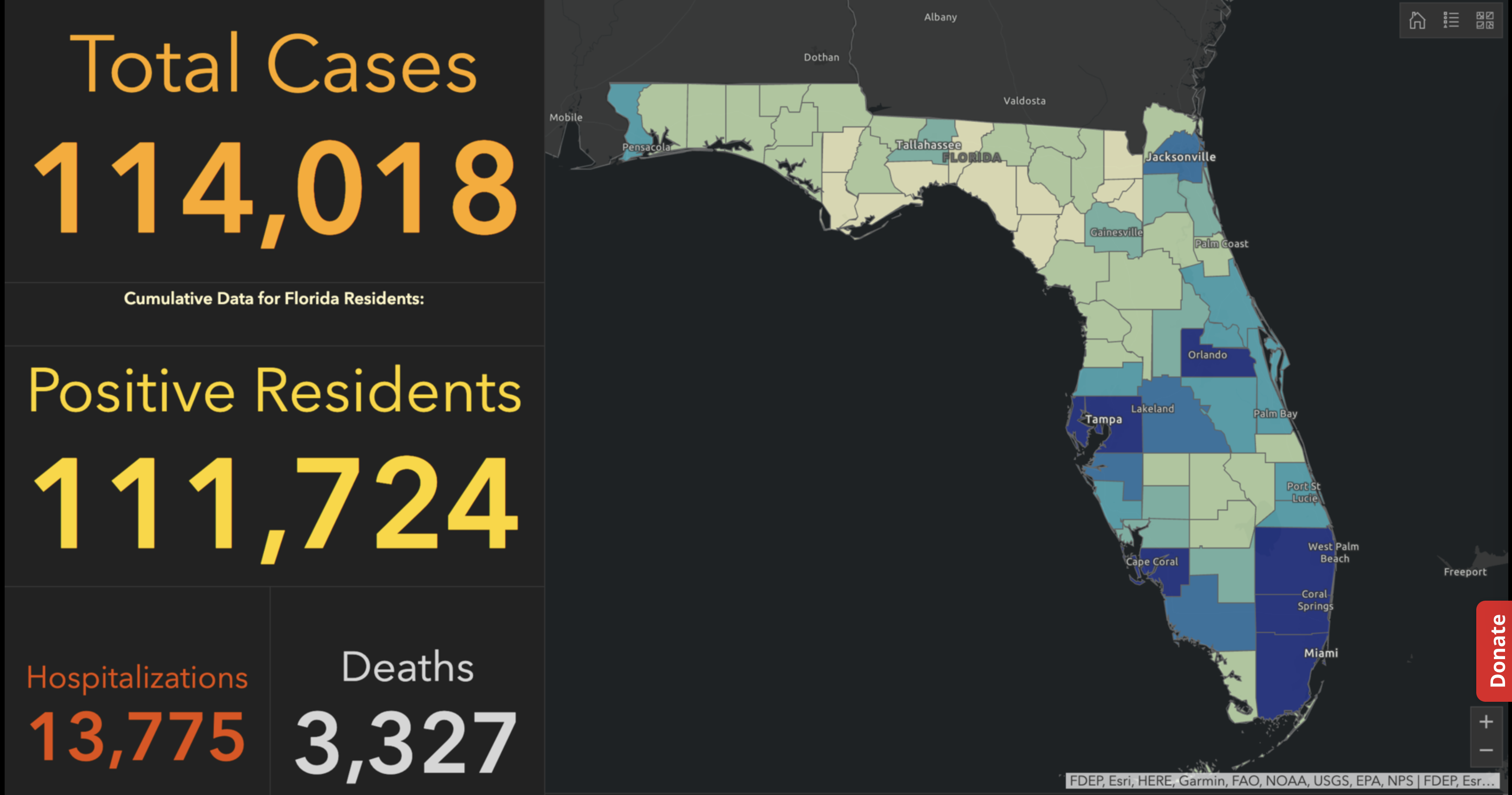 As the beaches of South Florida were readying to re-open, Jones, fearing the state fudged public health data irresponsibly, unethically adding negative tests in a false aggregate–even if conducted for the same person–to diminish the ranking of positivity, even as DeSantis proclaimed he was “following the data” in re-opening. Months earlier, Jones had created the dashboard and apologized for the lowering of mortality rates announced per Florida’s Dept. of Health, in the course of reclassifying many coronavirus-related deaths, as the Dept. and adding fewer deaths despite rising mortality rates in Florida to deaths verified as related to COVID-19. The state argued it would “continue to provide the most up-to-date information to arm Floridians with the tools and knowledge necessary to flatten the curve,” but seems to have shifted the nature of its total counts of deaths or indeed of positive cases of infection. But, unlike the state dashboard, Jones showed the density of confirmed COVID infections and the few Florida counties which, by her count, ready to reopen.