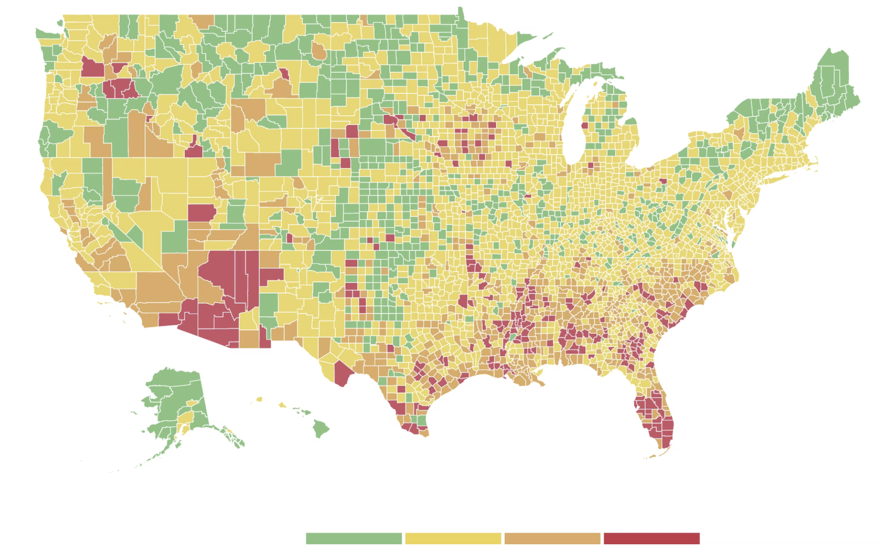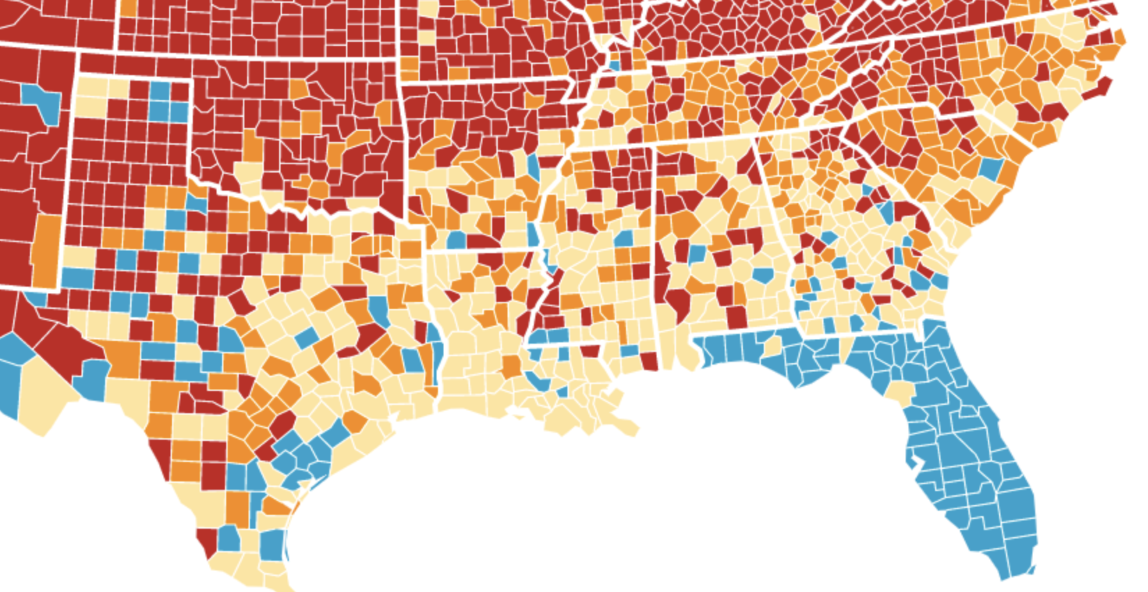 The lay of the land was basically not at all that clear-cut. One can only hope that few made travel plans after seeing that bright blue peninsula on social media: a better bet, it seems, would be Puerto Rico, if the mask-wearing mandate could be tolerated by visitors. In fact, the very areas that visitors might be hoping to travel–from Daytona Beach to Cocoa Beach, or the area around Miami and South Beach, down near the peninsula’s tip–suggested areas of substantial and even high risk, save for the area lying in the Everglades.