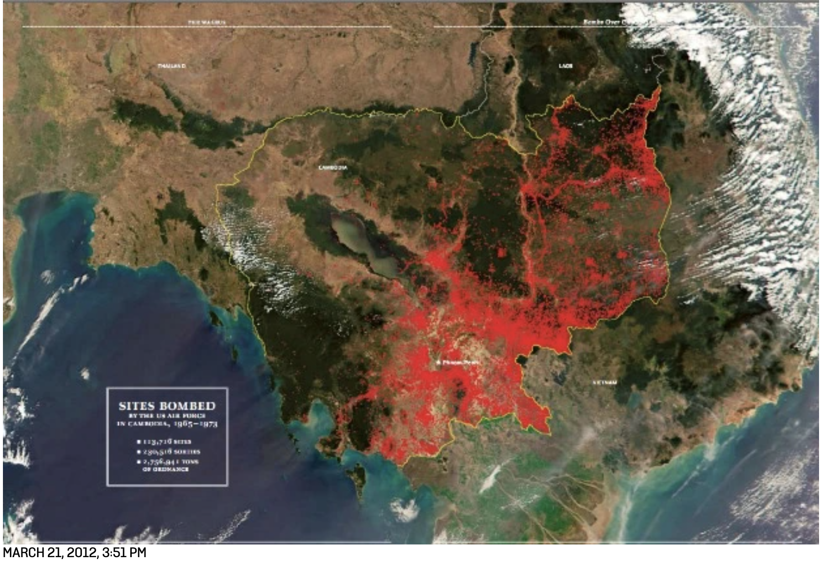–hardly mapped the increased intensity of air strikes of carpet bombing, the new illustration of force that blanketed the nation with strikes to cover borders between north and south Vietnam and the coast, as Air Force data reveals, releasing over two and a half million tons of bombs on over 115,000 sites in Cambodia, from 1969-72, of which over 11,738 were indiscriminate–with the blatantly false assurance from the military commander in South Vietnam, who requested the sites be targeted in a neutral country, that Cambodians did not live in them, in the wave of secret bombings ordered in violation of international law, and quickly developed by Nixon’s National Security Advisor Kissinger–