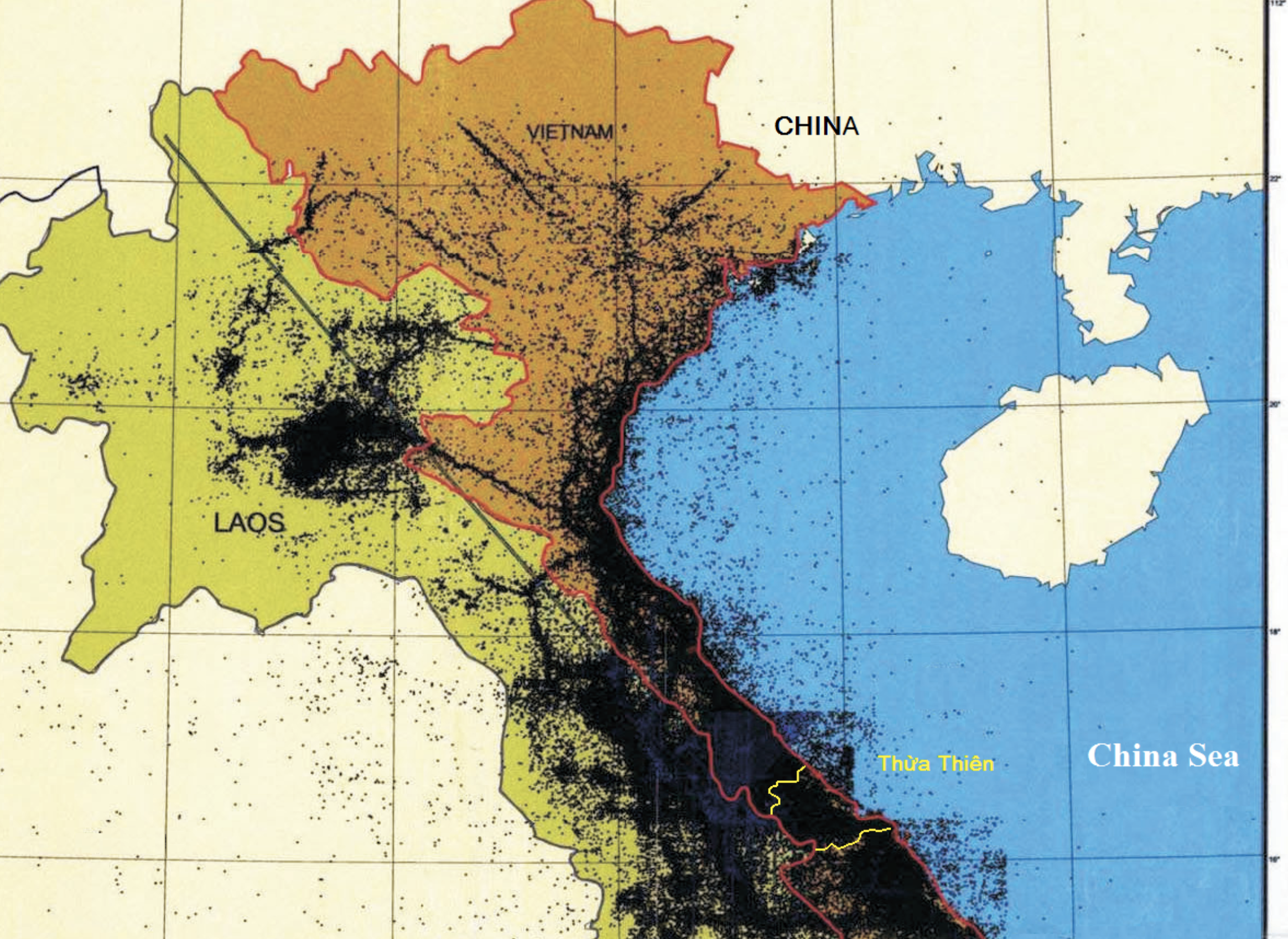 Aerial strikes offered a sense of security, notwithstanding, and aerial sorties that continued to exercise claims to global power even in an unfamiliar theater of combat, evident in the dark lines of ordnance dropped along fairly fixed flight paths on what were deemed strategic locations in North Vietnam, and dense napalm dropped in the Thura Thiên region, where the saturation with napalm provided a carpet bombing of unprecedented scale, with limited sense of the effects on the local ecosystems. The planes’ almost indiscriminate blanketing of the strategic Thừa Thiên province and mountainous border with Cambodia where Việt Cộng hid were blanketed with ordnance and herbicides including Agent Origin, creating a massive deforestation there and on the network of roads known as the Hồ Chí Minh Trail.