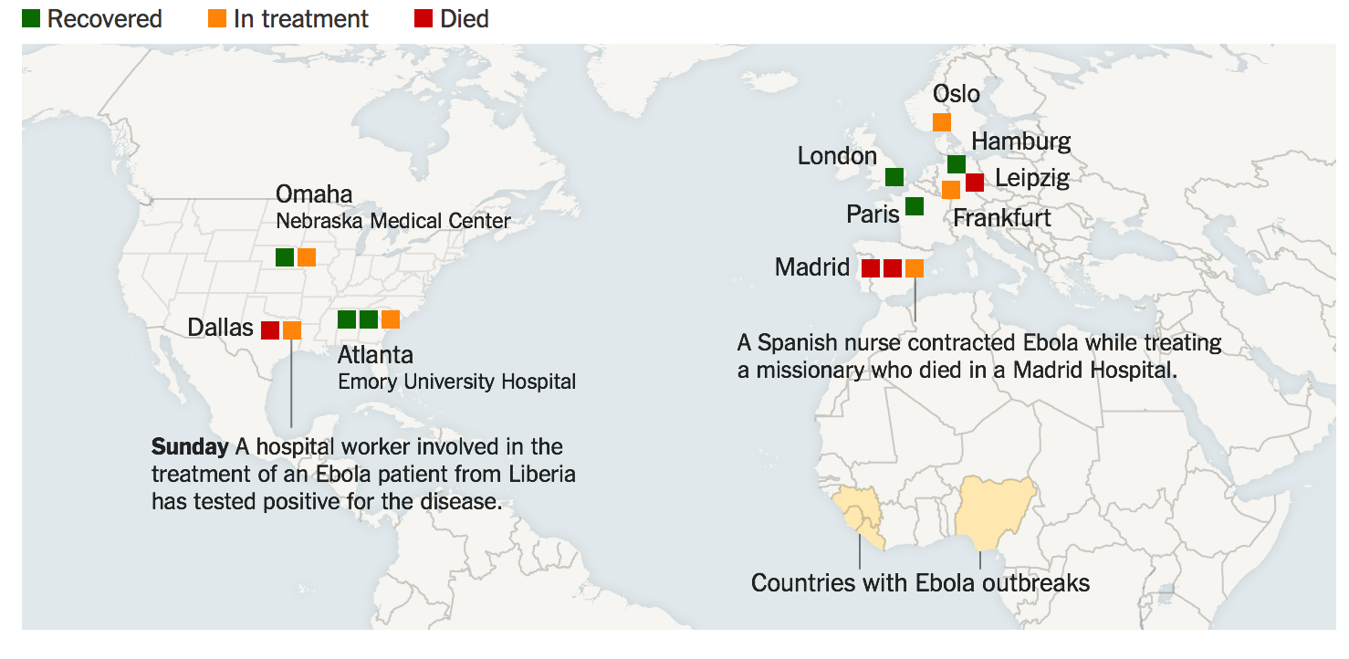 The irresponsibility of such a map, or self-made data-visualization, even though it was careful to note that no deaths from Ebola had yet occurred in several regions, almost intimated that the spread of the virus from West Africa, or out of the zone of its “widespread transmission,” had breached the barrier of containment. Far better is the graphic from the New York Times, which transposed the same data to a far less troublesome data vis, but is so striking for how it attached a medical narrative to the two cases contracted out of Africa it described, but where the slight narratives of different coloration contrast with the anonymity of the ochre spaces that mark “Countries with Ebola outbreaks,” as if the responsibility lay with their governments. How can one, indeed, give individual faces to the upwards of a thousand cases contracted each week.