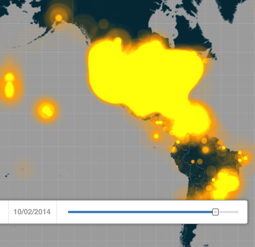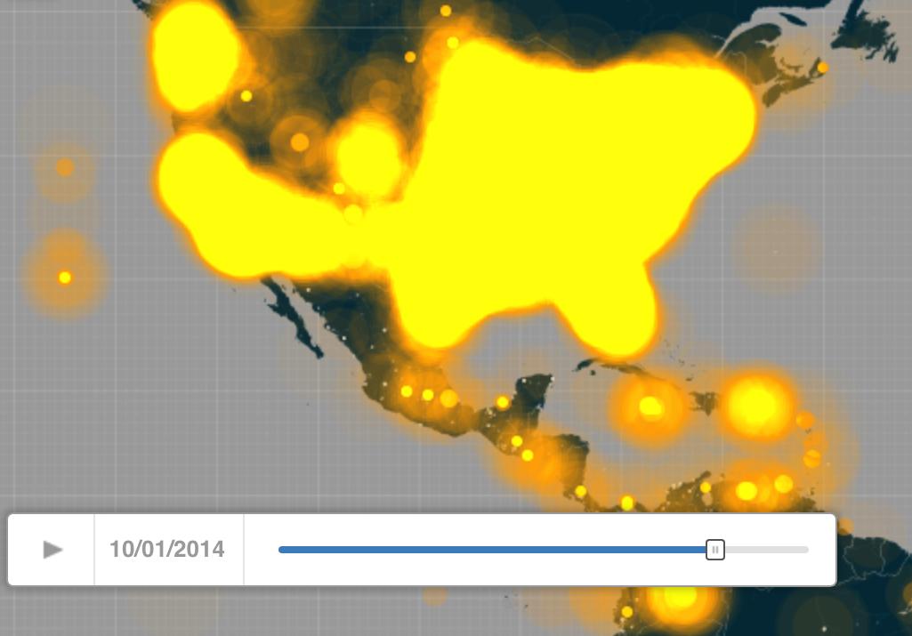 Fear is difficult to quantify by exact metrics or measures. But the increasing density of levels of tweeting with the term or hashtag of Ebola offers a barometer of alarm about Ebola virus’s transmission. For the 271 million active users of Twitter exploded with 140-character pronouncements about the arrival of the infectious disease across the Atlantic, beyond the expected boundaries in which the highly infectious disease had been first tracked over several previous months. The rapid expansion of tweets mentioning Ebola illustrates how the virus came to infiltrate (and infect) social media world-wide exploded from the first of October, when the increasing density of tweets in the United States’ 52.7 active users so drastically grew. The twitter maps show a marked explosion mentioning or tagged #Ebola dating from the announcement an infected Thomas Eric Duncan, a Liberian-American afflicted with the Ebola virus was being treated for the disease in Dallas on September 30. Within a week, and for the week before his recent death, the virus had migrated to national news when the arrival of a patient afflicted with Ebola in the United States had raised questions of how his arrival had not only been permitted, but how the way that Duncan had gone untreated after arriving at an emergency room in Texas Health Presbyterian in Dallas opened the avenue to the infection. Even as confidence grew that health risks were minimized, the density of tweets that illuminated the country insistently up to just three days before his death, as if threads that so inundated the twittersphere had themselves grown so intense so as to obliterate the boundaries of the United States, so intensely exchanged were tweets to overload the mapping abilities by firing off some 6,000 tweets per minute with astounding rapidity, compared, according to Time, to a frequency of 100 tweets per minute in the days before September 30.