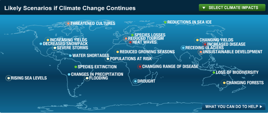 The map does not exploit its own conventions of orienting readers to space or expanse. But GIS mapping offers a significant range of angles by which to read and explain its content. The relevance of clarifying readers’ relations to the environment are in fact pressing, as revealed on this interactive map–which even includes an option for the reader to learn in detail what s/he can do to help: