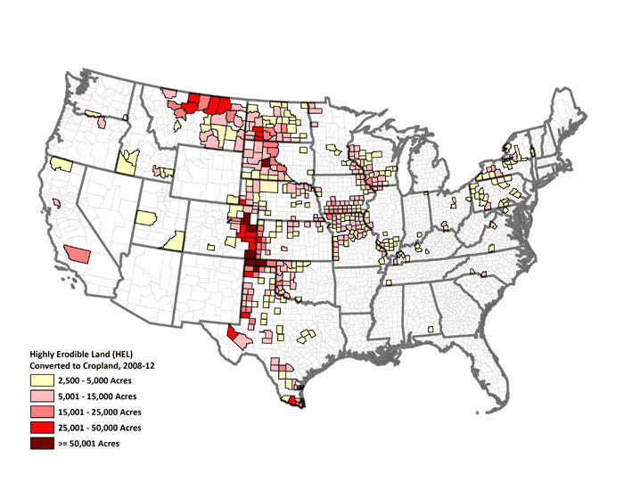 6. Such representations reflect the realities of the shifting agrarian landscape. They offer resources to refine our picture of the land by delineating varied concentrations of national resources by government investment. These representations of agrarian landscapes serve as a gauge to negotiate our relations to reality, as much as to measure them, placing into visual relief how we project value onto agricultural landscapes without attending to the specificity of their character–and tend to link value to the continued economic productivity of rural lands in ways that deny local changes. This even extended to the conversion of much “highly erodible land” (HEL) into cropland for moneys from 2008-12, often to intensify the farming of subsidized corn and wheat, filling areas from Montana to Texas that are centered in what was once a Dust Bowl devastated by persistent drought.