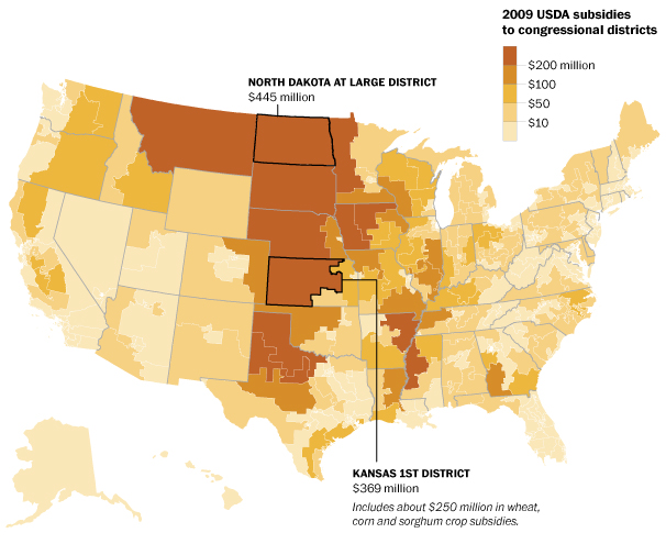 Despite the typo, the map displays an astounding concentration of relative farm dollars in North Dakota, South Dakota, and Nebraska–as Kansas, the southernmost state shown in the below map of subsidized farms in local counties, and bright blue Montana in the upper left.