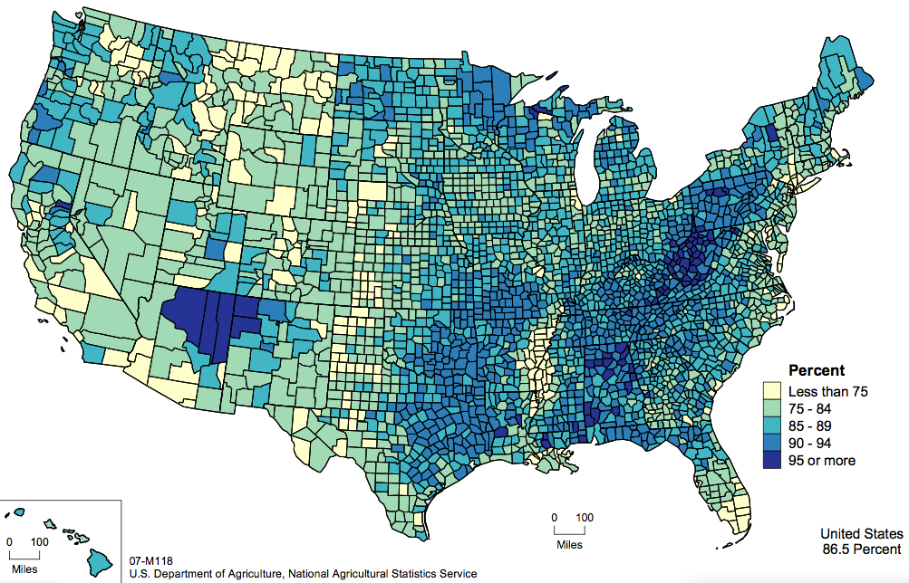 By reconsidering the range of forms of mapping farms and the use of farmlands, we must consider the landscape of farming in which we increasingly live, even if our food rarely derives from it. US farming incomes have appreciably risen since 2010-11, attracting some financial markets, but the dynamics of farming are too often based on models of extraction, rather than of nurturing the local landscape. As the production of corn has increased, since 1980, 400 percent, soybeans 1,000 percent, and wheat 100 percent, as US Secretary of Agriculture Tom Vilsack has noted, largely based on agricultural technologies and machines, including GPS seed drills, combines, and tractors, the mapping of farms have relied on being under-written by tax dollars to the tune of 30-50% by government agencies that have less regard for the mapping of farmlands. If crop insurance has helped to increase productivity some 50% since 1982, the expansion of farming technologies have shifted attention from the ecosystems and landscapes: cropland used for crops declined almost uniformly by about 50% since 1982, especially in the Northern Plains, and land-use for crops by 13%–at the same time as the amount of land dedicated to pasturage markedly increased. Corn, soy, wheat, hay, cotton, sorghum and rice traditionally constitute the bulk of farmed land; corn, soy, and wheat remain the largest cultivated crops, but the production of corn has peaked.