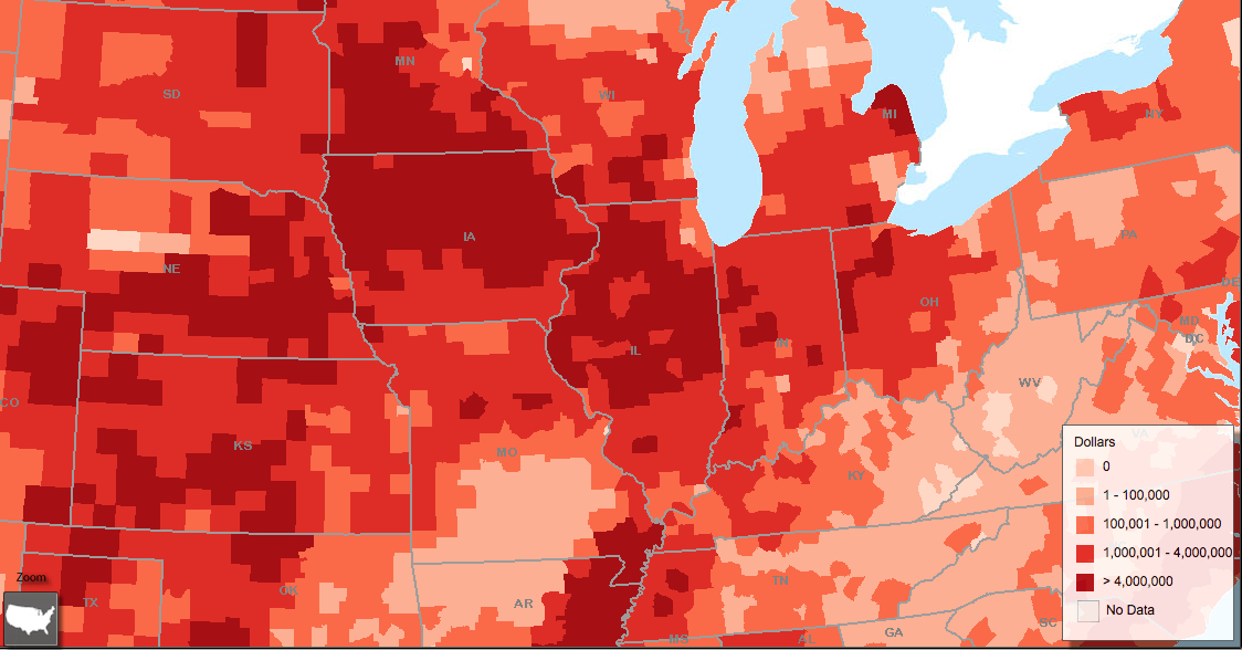 The patchwork strip of heavy indemnities of over $10 million per county, designated in dark brown, that run across the center of the country in 2010 (and are particularly concentrated in North Dakota, Nebraska, Colorado, Kansas, Oklahoma, and Texas–all big foci of federal farm expenditures) raises question of the allocation of farm dollars in any Farm Bill, and indeed how to encourage local best practices with federal policies. Can such levels of indemnity be fiscally justified as a food policy?