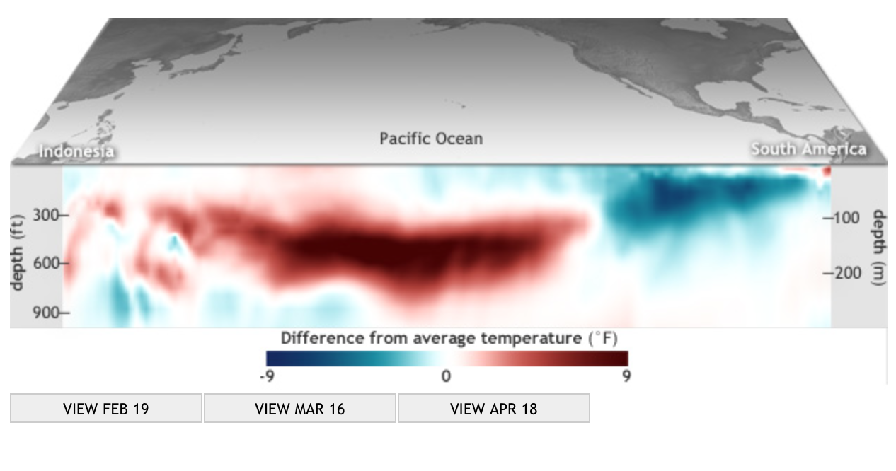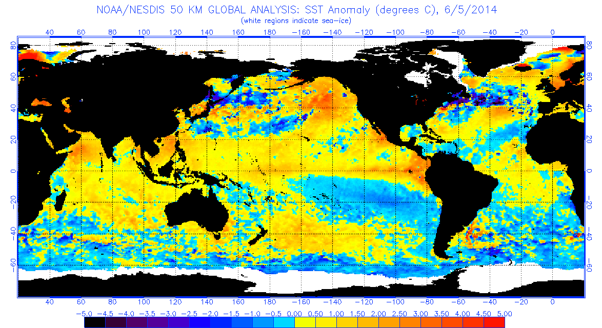 The satellite thermal map of the swelling of seawater around the equator, generated by NASA’s Jet Propulsion Lab, tracks the temperatures beneath the swelling of oceanic waters to forecast El Niño oscillations this summer and fall. By tracking significant sea surface temperature anomalies, they trace changes to gauge the possibilities of potential future major weather disruption of the globe, and to try to comprehend the shifts in temperature that might change weather systems in so drastic a way to impact food chains, agricultural economies, and climactic experiences in similarly out of the ordinary ways, exposing the otherwise hidden shifts in ocean temperatures by catchy chromatic spectrum of colors around the equator.