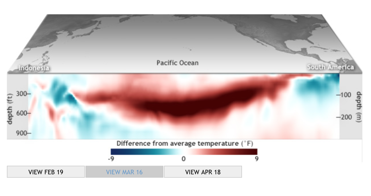 The spread of warm waters across the Pacific indicated in such maps echo the famous charting of sea-temperature anomalies of 1997-98 El Niño, which La Niña followed, when the end of trade winds led warm waters to slosh Eastward, pushing cooler water down from the surface, and interrupting the feeding habitats of fish and aquatic environments and interrupting the local marine food web. The map traces shifts in surface temperatures by tracking of anomalies in the below video to suggest an advancing augmenting of surface temperatures across the equatorial Pacific.