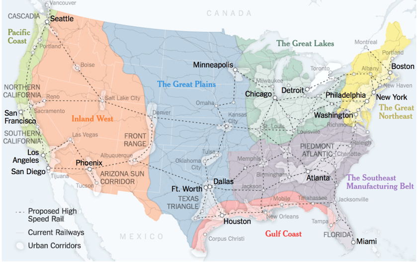 The map affords a prospect of tangibility and coherence, particularly compelling in its abandonment of the “state” or “county” as a unit of the polity, and appealing in its potential encouragement of a new sense of infrastructure–a term that provided such an appealing keyword way back in the midst of the 2016 American Presidential election–even if the New Map for America was presented for the lower forty-eight as a sort of forward-looking economic blueprint before the General Election, as if to orient us to a vision of the pastels of a future less brash than the red vs. blue electoral map, its regions far more recognizable, and decisively upbeat, from Cascade through the Great Lakes and Texas Triangle to the Southeast Manufacturing Belt. The hope is to respond to a sense of dislocation by more meaningful economic units, and indeed an agenda to move forward advanced in Connectography: Mapping the Future of Global Civilization, a hopeful manifesto to shift debate from territorial units and semantics to a vigorous statement of economic power.