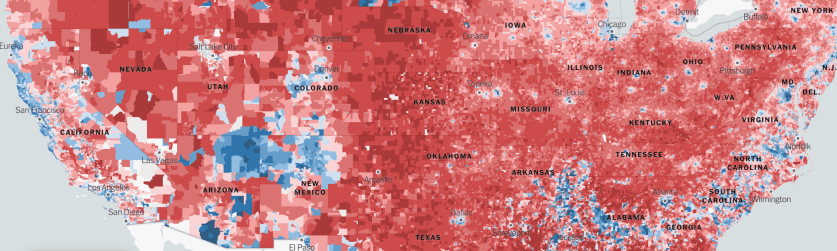 –and so we pored over visualizations of the nation’s new voting patterns that were increasingly and perhaps over-generously provided to stunned media viewers with a sense of collective trauma, to be processed only by reviewing endless cartographical parsings of the deep reds of the adjusted choropleth of 2016 revealed the coasts could hardly understand the intensity of the interior, seeming to reveal a convincing record of a deep-set urban-rural divide in a map of county-by-county voting trends.