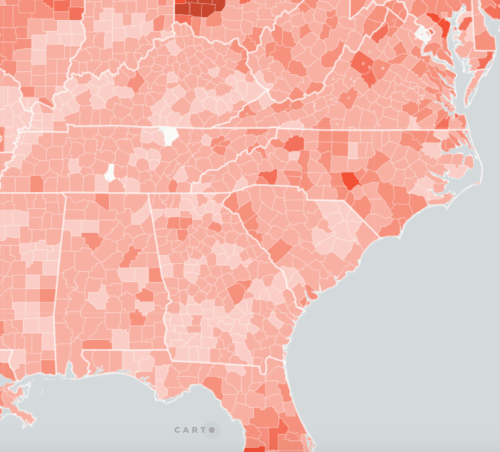 –but that feel alienated from its constitution of reality, because that stands at a remove from their lives and regions. The existence of pronounced “news deserts” in areas as Appalachia suggest a fragmentation of our news economy that weakens local solidarity and opinion, and creates large voting blocks that are terrifyingly coincident with the paucity of local news sources, as Chisolm’s below burnt red interactive Carto data vis rather scarily reveals, as it invites and allows one to explore in even more fine-grained from over the lower forty eight. The blanked-out regions of lightly hued regions reflect areas aggrieved areas by the absence of a diversity of local newspapers–institutions long identified with reflection on local political institutions and practices. They are, in other words, afflicted with the absence of a plurality of avenues for the shaping of public opinion and political debate, and bound to rely one less active political debate.