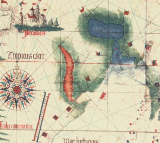 The spatial mapping of coastal cities in the Mediterranean, and situation of coastlines in a broad nautical expanse–both in relation to both equinoctial lines and vertical bars of latitude however provided an alternate orientation to the network of the web of loxodromic lines of the compass rose. The below schematic version of a portolan chart, signed by Juan de la Cosa of c. 1500, provided a distinct frame of reference and spatial indices to enumerate points of landing and prominent capes in the New World at different latitudes for its readers.