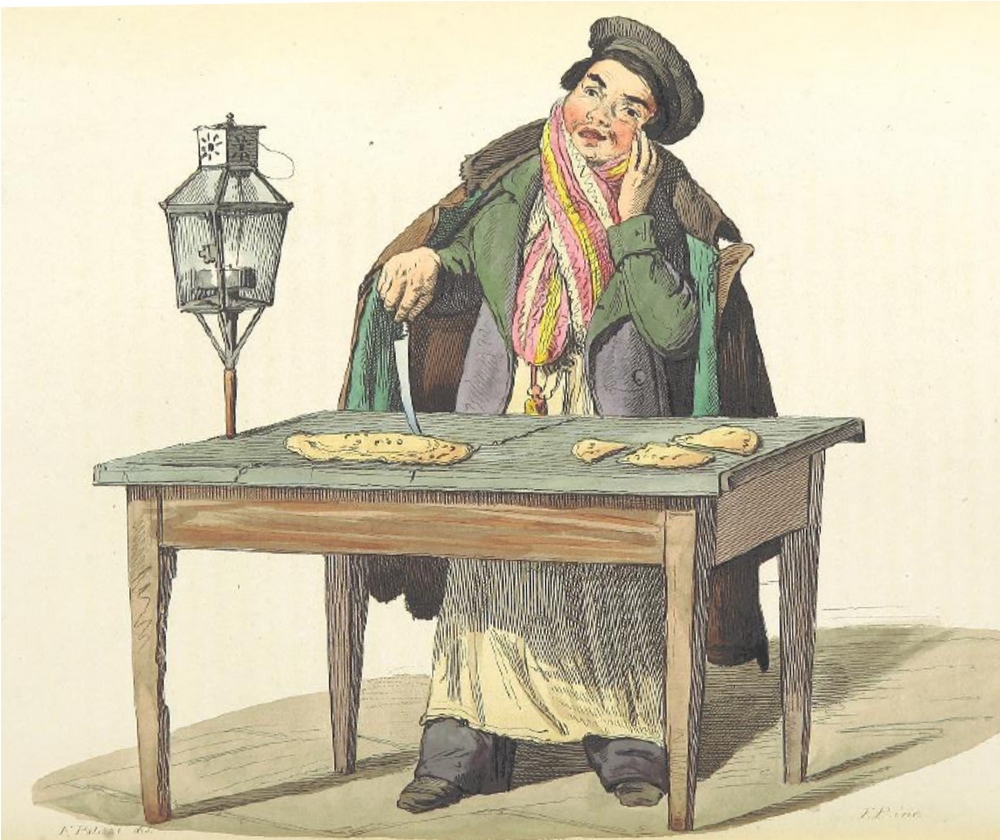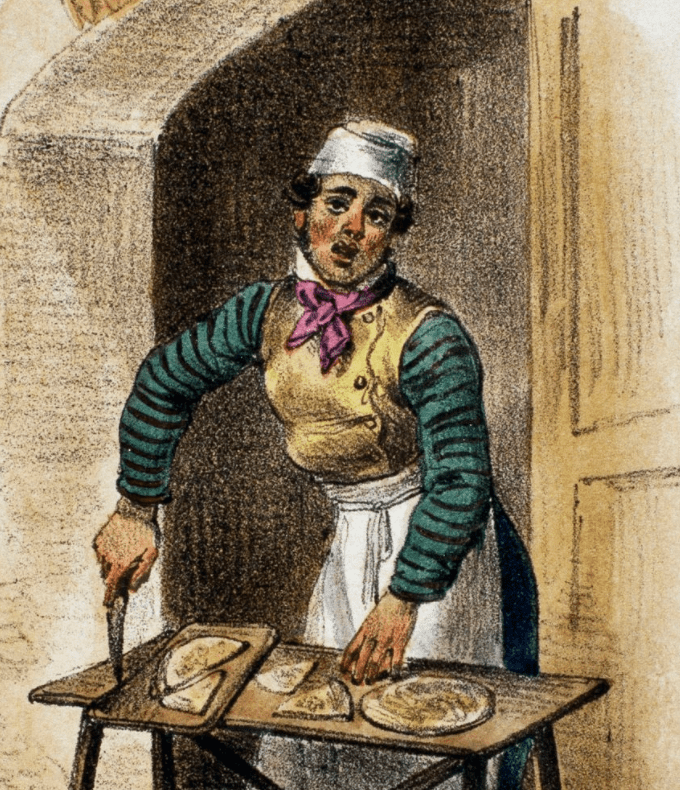 Perhaps no gestures were required for the Neapolitan hawking pizza to passersby for ready consumption in the 1830s was sold as one of the picturesque “street-views” of professions in Naples, in a precursor to the pizza slice, chef’s hat, and long white apron, occupying a clear social role held in an urban environment–and conducting a quintessential face-to-face encounter on a Neapolitan street promising a populist mini-meal, prepared with pride even if served on a improvised wooden stand.