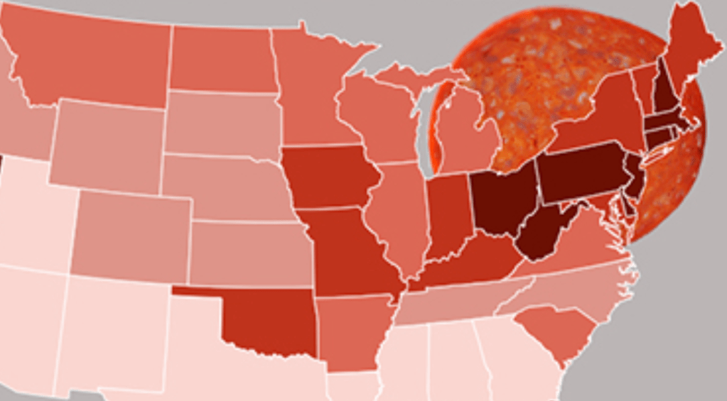 For in this context, as frozen pizza totaled a full tenth of all frozen food sales in the United States by 2010, topping $3.2 billion, a share forecast to surpass $20 billion by 2025, the non-local pizza shipped, sold, and favored across the world that has subtracted fantasy or creativity from our collective culinary horizons has brought us to remap the pizza within the Italian peninsula, and to champion the tradition of blending tomato sauce on bread as a birthplace of a global food. For the expanding consumption of pizza seemed to have proved that the world was indeed flat, delivered not only from a flat box, but reducing the globe to a pie chart of slices of global revenue, less inspired by invention than the marketing strategies that had allowed profits to grow along global “regions,” stripped of much local variation in fresh foods or fantasy of the arranging freshly cooked ingredients on a pie.