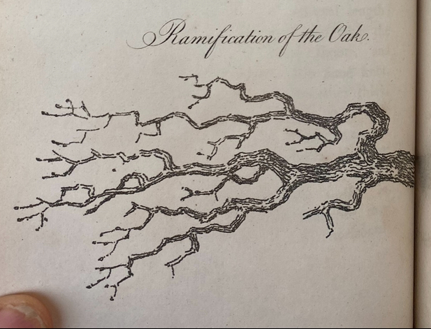 There was a Thoreauvian sense of transcendence of the local that animated Margolin’s attention to the environment, of which the oak might stand as a transcendent icon. Although oak moths have recently arrived in the richly brachiated canopy of the large coast live oaks in UC Berkeley, as they regularly do, feasting o foliage of the Quercus agrifolia for multiple recent years–2019, 2020, before again 2025–and prematurely cause grey and brown litter of leaves to fall in heaps, live oaks endure the regular pillaging of leaves, returning to their familiar evergreen in a manner of weeks, as they regenerate buds, leafing out once again in a matter of months. suggesting the huge vitality of trees that seem sick. The rapid recovery that the coastal live oak makes regularly from the onslaught of voracious caterpillars as the e California oak moth strip the trees of their expansive verdant canopies without impact on the trees’ long-term health, as within three months they leaf out, regaining health almost suggestive of a rebirth by deep reserves of energy–making it unsurprising Malcolm adopted the distinctive tree as an emblem for much of his work. The brachiation of that oak branch recalled the eighteenth century aesthetic renderings of Reverend William Gilpin, one of the earliest coiners of picturesque “landscape,” with a scientific attention to detail, attening to natural forms as if revealed truths–admiring that “peculiar kind of beauty, which is agreeable in a picture” as able to provoke a discerning interest in the wilderness as providing esthetic forms–