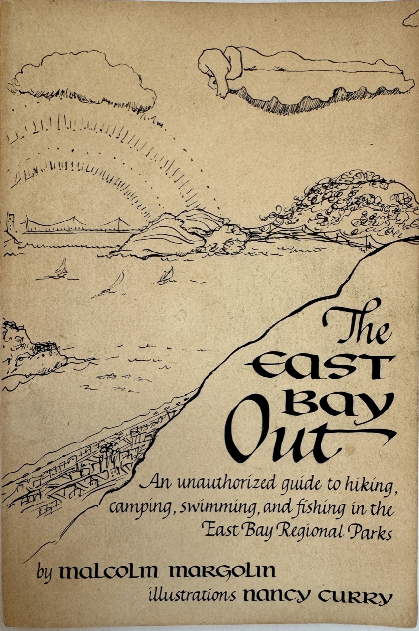 The dreamy cover of that “unauthorized” paperback guide to the region–East Bay Out (1985)–certainly offered a decidedly off-road record of outback experience of the region, neither a God’s eye or bird’s-eye view, its old cover featured a blissed out Malcolm or reader floating above the bay from atop a cloud, looking down on a built but intriguing bayshore, as if in harmony with nature, ready to descend explore the open areas for camping and swimming the book described. (It is hard not see the cover, as I never did before, as an image of Malcolm Margolin floating as a benevolent spirit presiding above the coast of a region he celebrate with enthusiasm and came to know well.). If perhaps the figure on the cloud was an iconic persona of the Aquarian Age, Malcolm adopted the calligraphic skill of Bay Area penmanship to invite all readers to tap their inner Thoreaus in the guide to living outdoors–hiking, camping, swimming, and fishing–in their own Waldens able to be discovered not far from the edges of urban life in the East Bay Regional Parks. An evangelist and a guru, as much as a historical anthropologist, Malcolm led the way from his own cloud to the future.