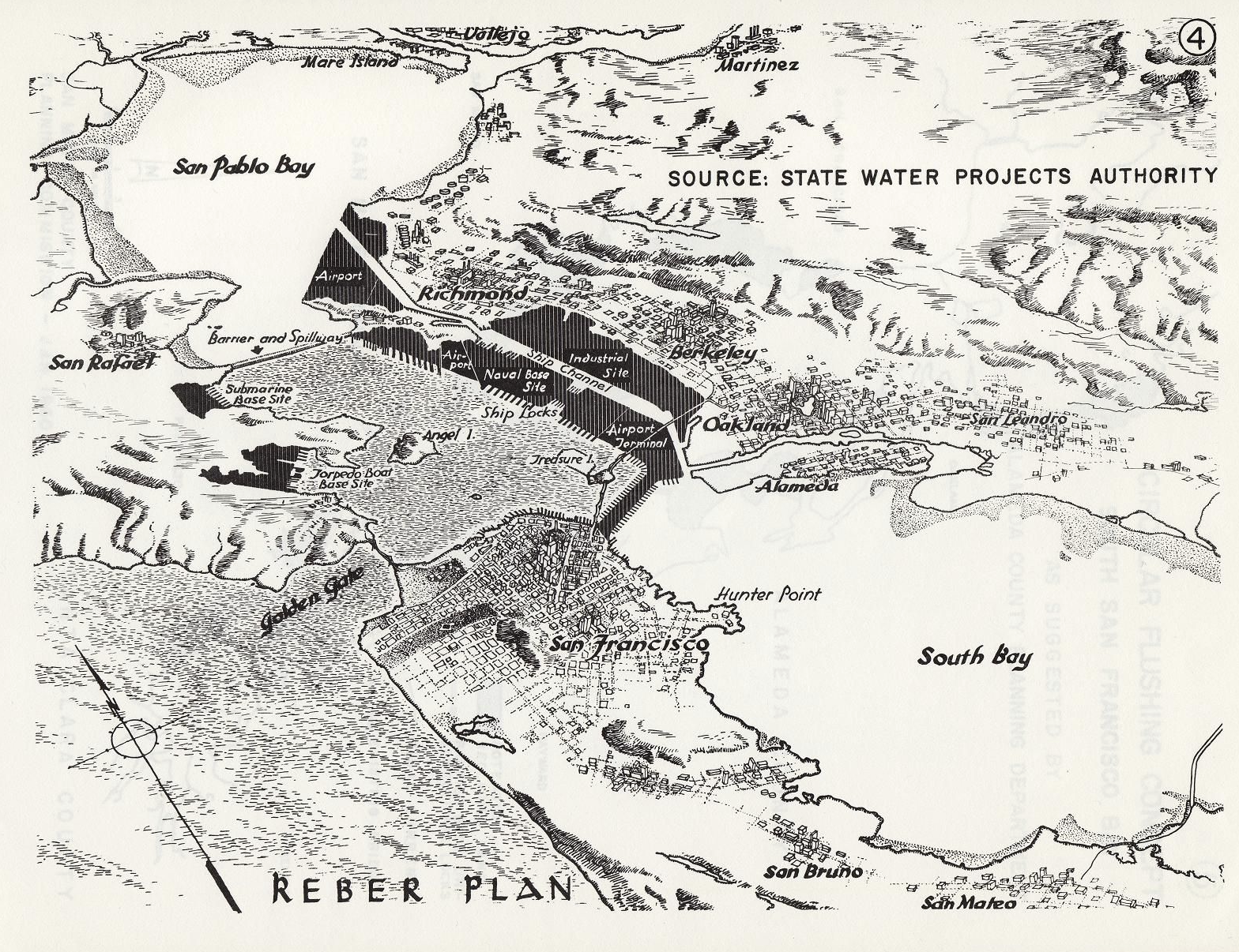 Before the Bay Bridge was imagined, Brower got behind the project proposed by civic engineer John Reber to dam not only the San Pablo River but to built a San Pablo Bay at the dammed San Pablo Reservoir, a project already so devastating to the ecosystem of regional grasslands. For Reber had in the late 1940s proposed a way to meet the postwar population growth in the region by adding a huge amount of landfill to the bay, ending its wetlands, and engineering two freshwater lakes that would divide the “Bay” into four zones, preserving but a newly dredged deepwater port in Berkeley. The almost forgotten plansto foreclose Bay waters and tidal shores showed little familiarity with the region–it might easily have been fully liquified by seismic activity!–but provided a model of the distance of local engineers of urban development and State Water Projects Authority from the custodial role indigenous had long played in maintaining the bay as a region of vital habitat, both of freshwater fish, sea grasses, and shorebirds–and the proposal for a massive construction project that projected the San Pablo Dam as a basis for the bay was only narrowly defeated due to the local activism–only after the over-eager U.S. Corps of Engineers builds a 1.5 acre hydraulic model of the Bay to test it, although the vision of barriers to bay waters stretching from Richmond to Treasure Island, essential to shipping channels, never survived the modeling of a bay comprised of landfill–a massive engineering project of terraforming before that world was used, luckily never realized.