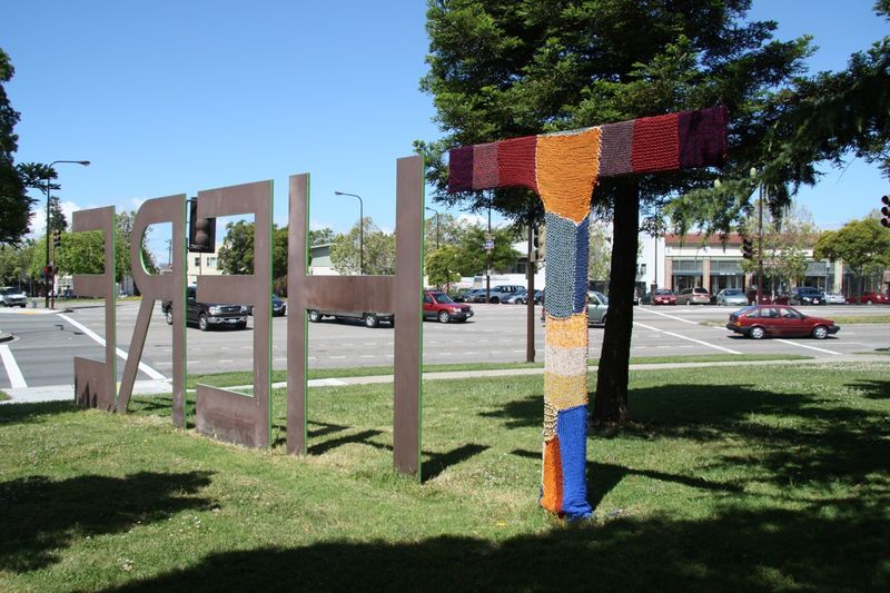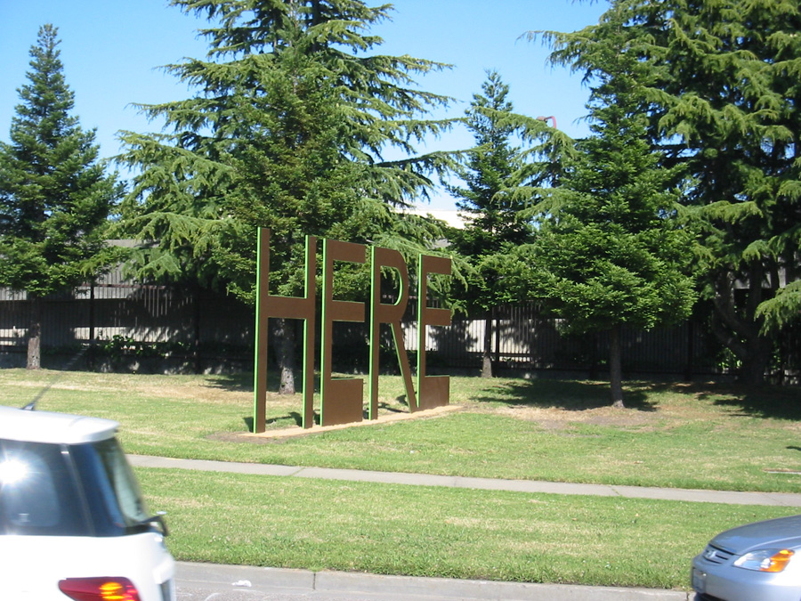 The erasure of a sense of “here” that was promoted by the public sculpture seemed erased in the AI map, that reduced space to built houses, even as the homeless were the only residents in sight as I walked around the tensely empty neighborhood. I’d long appreciated, if a bit begrudgingly, how the Gateway_Project defined the edge of Berkeley CA took Gertrude Stein’s saying and liberalized it in hight-foot tall powder-coated steel letters, where the BART tracks go underground, intended as “a literary and whimsical welcoming to Berkeley,” where they supposedly read not only Stein’s poetry, but where so many poets had lived–and was a “here” worth commemorating by sculptured letters, a new Fons et origo of the Beat Generation, perhaps, or a dynasty of mid-twentieth century poets–Kenneth Rexroth; Czeslaw Milosz; Allen Ginsberg; Gary Snyder; Frank Whalen; Thom Gunn; Robert Hass–by 2002 recognized as a literary patrimony. Designed primarily for passing motorists, as if few could be imagined to walk nearby, the site built to commemorate a “sense of place” had become a cluster of encampments, as if that was the only place that existed at a time when all remained shuttered indoors–if in 2010, just ten years ago, one letter was covered, by a group of Oakland knitters, to transform it to “HERE/HERE,” peacefully protesting the work as barely concealing an agenda of gentrification.