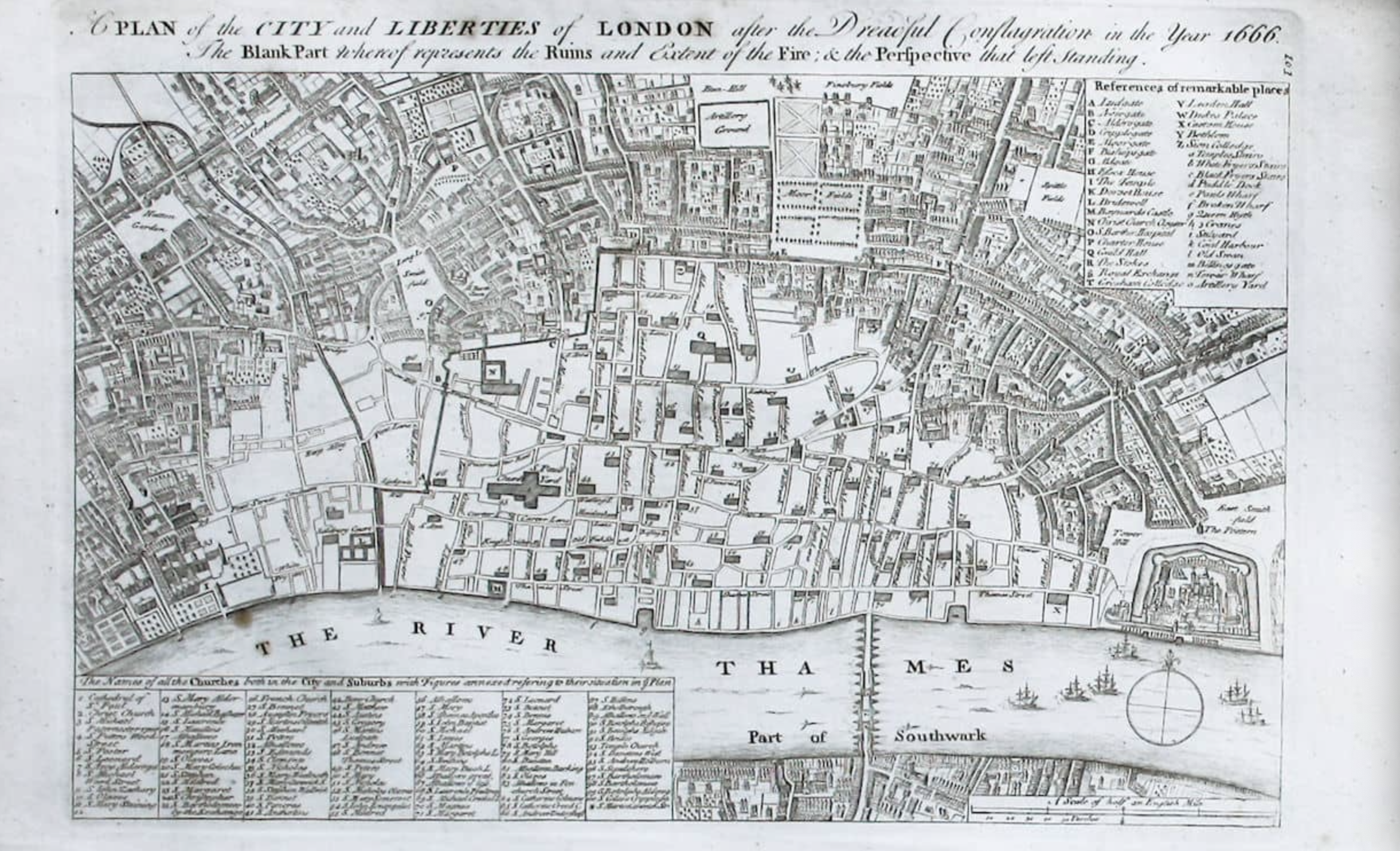 Franklin boosted public interest in the need for such insurance policies in best practices. He printed an anonymous letter, and perhaps penned it, arguing not only an end to “the detestable practice of putting wooden Mouldings on each side of the Fire Place,” ignoring their combustibility, by due diligence: “if Chimneys were more frequently and more carefully clean’d, some Fires might thereby be prevented,” leaving “People in Confidence that they are clean, making large Fires” and that ” in the Affair of Extinguishing Fires, tho’ we do not want Hands or Good-will, yet we seem to want Order and Method.” The Boston Fire Society existed from 1717, equipped with ladders, pails, engines and axes, to prevent fires’ spread, but it seems to have been made indelible by Defoe’s account of the scale of destruction of London’s 1666 Great Fire, and the mapping of the extent of the damages of the Great Fire, and indeed by 1744 the model for the rebuilding of London’s burned down center by Christopher Wren.