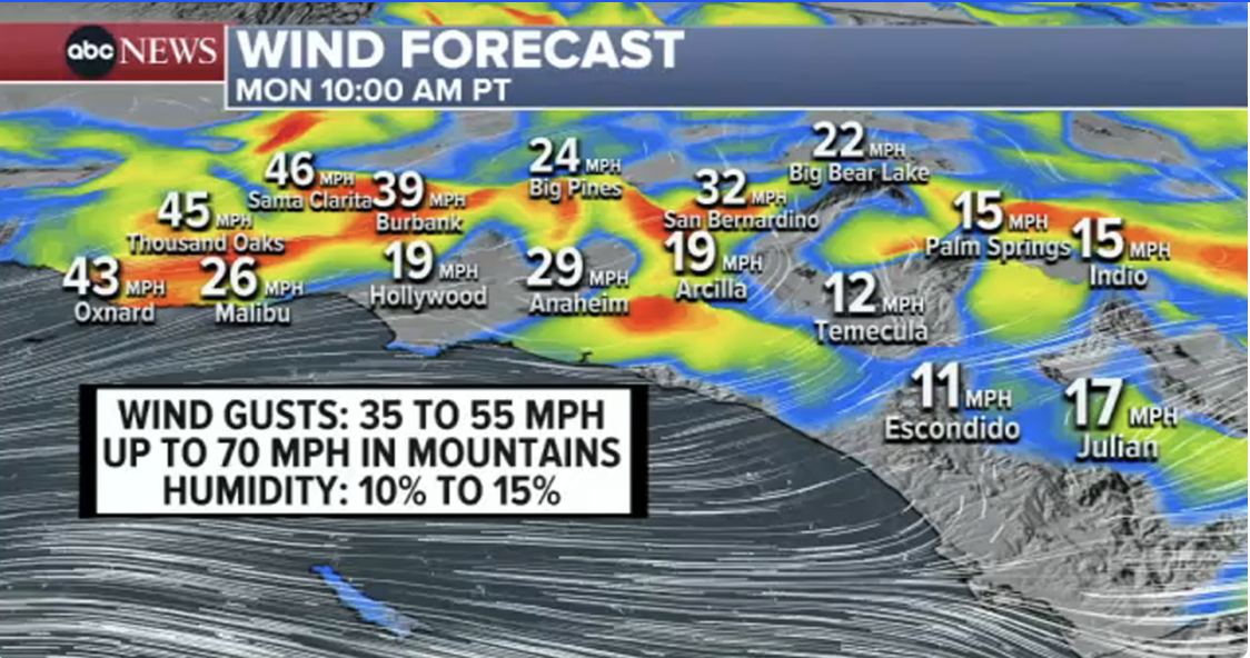The extraordinarily strong Santa Ana winds that whipped up the flames of fires of up to forty and sixty-five miles per hour–over the speed limit!–that fanned the hills were pointed to for the inferno of the “particularly dangerous situation” in mid-January 13, as urged warnings were issued about infernos that had caused $250-275 billion in damages to property and were not contained, as gusts of wind grew from thirty-five miles per hour to seventy miles per hour, carrying flames and embers across a dried out landscape that indeed lacked water, and where fire fighters had no water in the ground, as they were forced to make heroic fire-drops–and we depended on them to contain the increasingly fanned flames, in ways hard to separate from the heightened levels of fire risk.