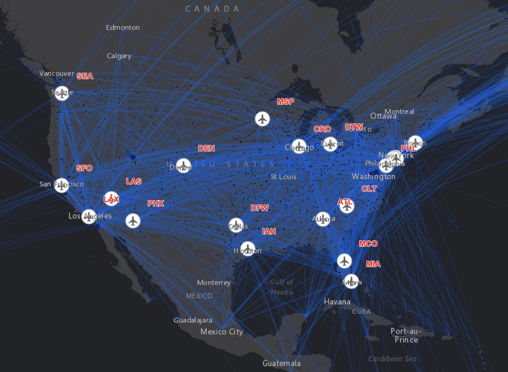 The towers studded across the nation, which are in control of all flight paths at distances from five to forty miles at the densest sites of air traffic, control routing and altitude over immense swaths of national air space, mandating the point at which any aircraft can clears 18,000 feet, when movement is permitted in the cabin, and more. If New York’s control tower covered a sixth of all global flights in 2015, the dispersive governance of the skies manages the scheduling and routing of air traffic of increasing density we never observe from the ground, filtering routing and scheduling decisions through an extended network and routing system, as the hands of local controllers using automated flight routing systems, but control final routing and scheduling from quite dispersed local hubs, within twenty-one united “states” of airspace of disproportionate air traffic.