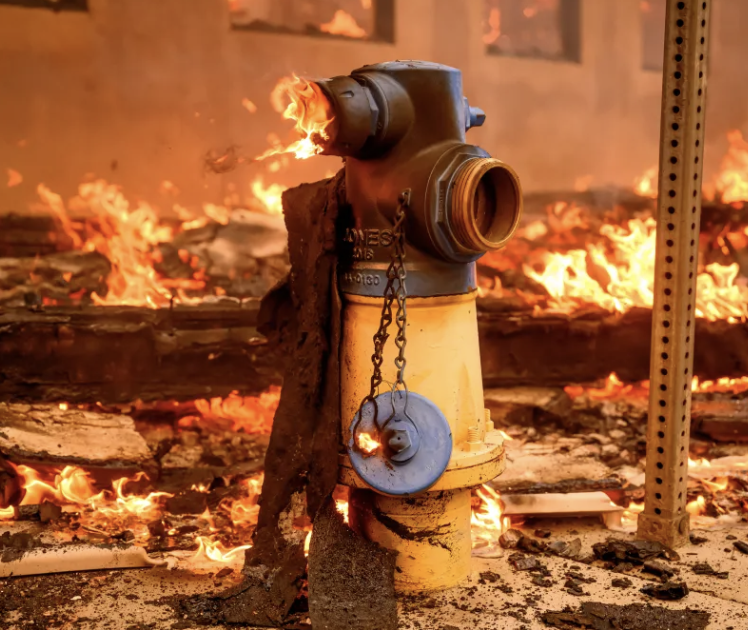 The ghostly form of burnt iron hydrants have become a haunting of the Palisades, a memento mori of modernity and even a haunting of the nation. The skyrocketing demand for private hydrants across Los Angeles seems to mark a major retreat from public utilities, as the hydrants running dry became a spectacle of spectacular failure, rather than a wake-up call. Streamed on media, the rusty hydrant became an emblem of infrastructural failure, and “absolute mismanagement by the city” as if it were a failure of governance that hinted at the failure of public protection. Local storage in tanks had been drained by heavy use in the uphill areas, however, as pressure for long-term usage had decreased so dramatically to make the preposterous charge that local authorities had denied needed water flow by failing to priorities local communities. But the image of the hydrant that ran dry became an emblem of what was wrong in America, the stationary hydrant enduring flames an icon of what happens a state run by a Democratic governor and with a Democratic mayor.