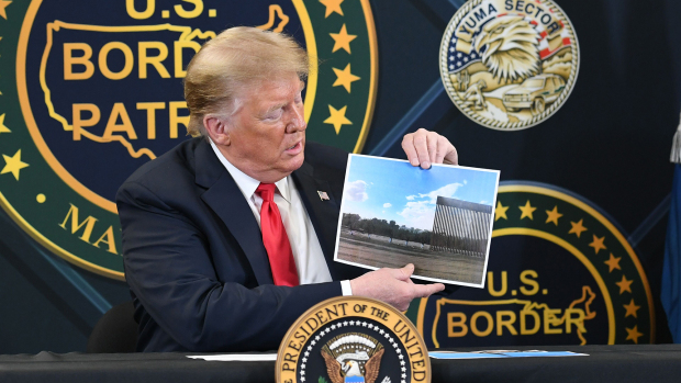 US President Donald Trump shows a photo of the border wall upon arrival at the US Border Patrol station in Yuma, Arizona, June 23, 2020, as he travels to visit the border wall with Mexico. (Photo by SAUL LOEB / AFP) (Photo by SAUL LOEB/AFP via Getty Images)